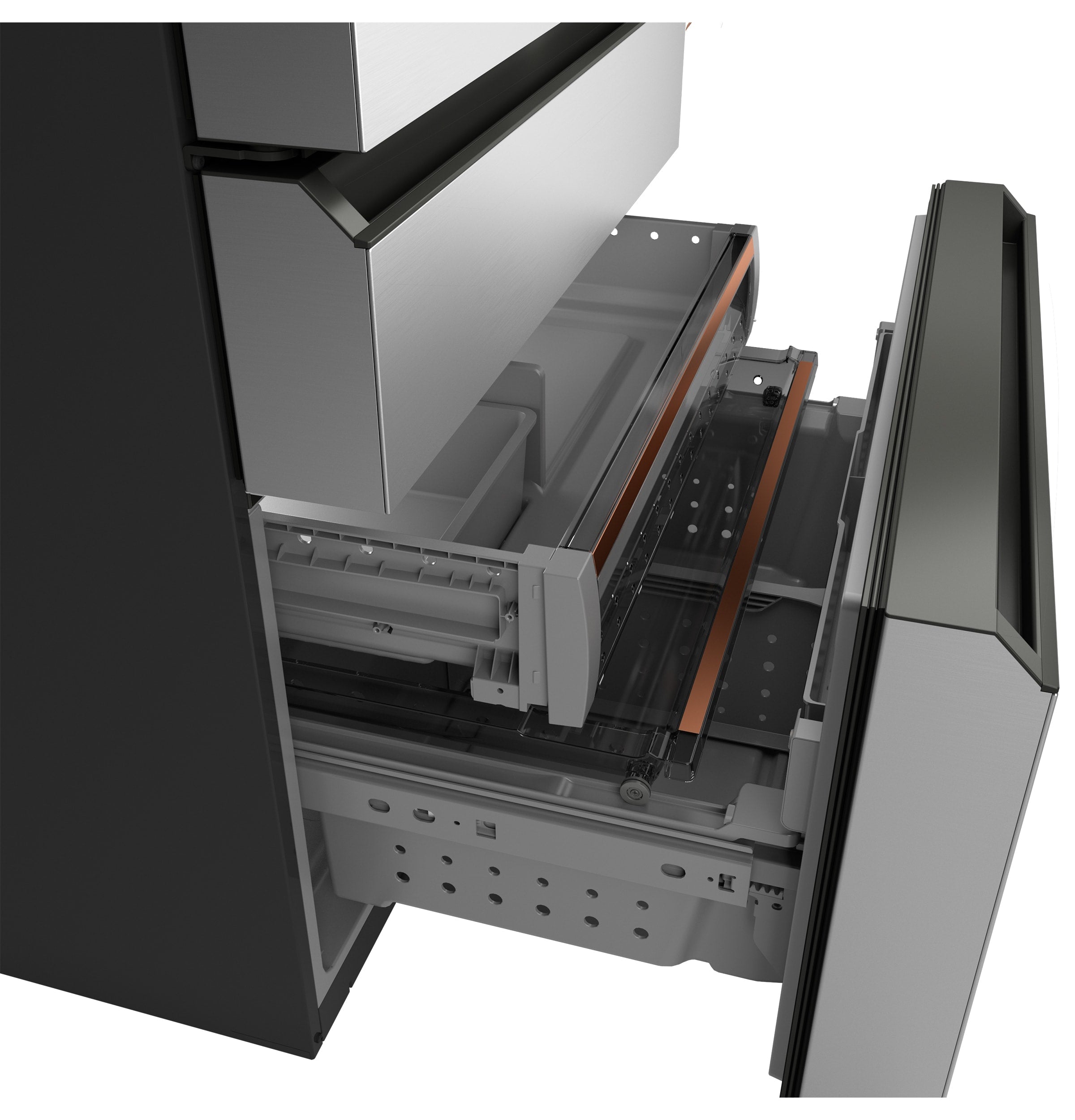 Flatbread Freezer Compartment - a slim, full width freezer compartment designed to hold flatbread, pizzas, and other uniquely shaped frozen items is one of the many sliding shelves and trays in this three-level storage system