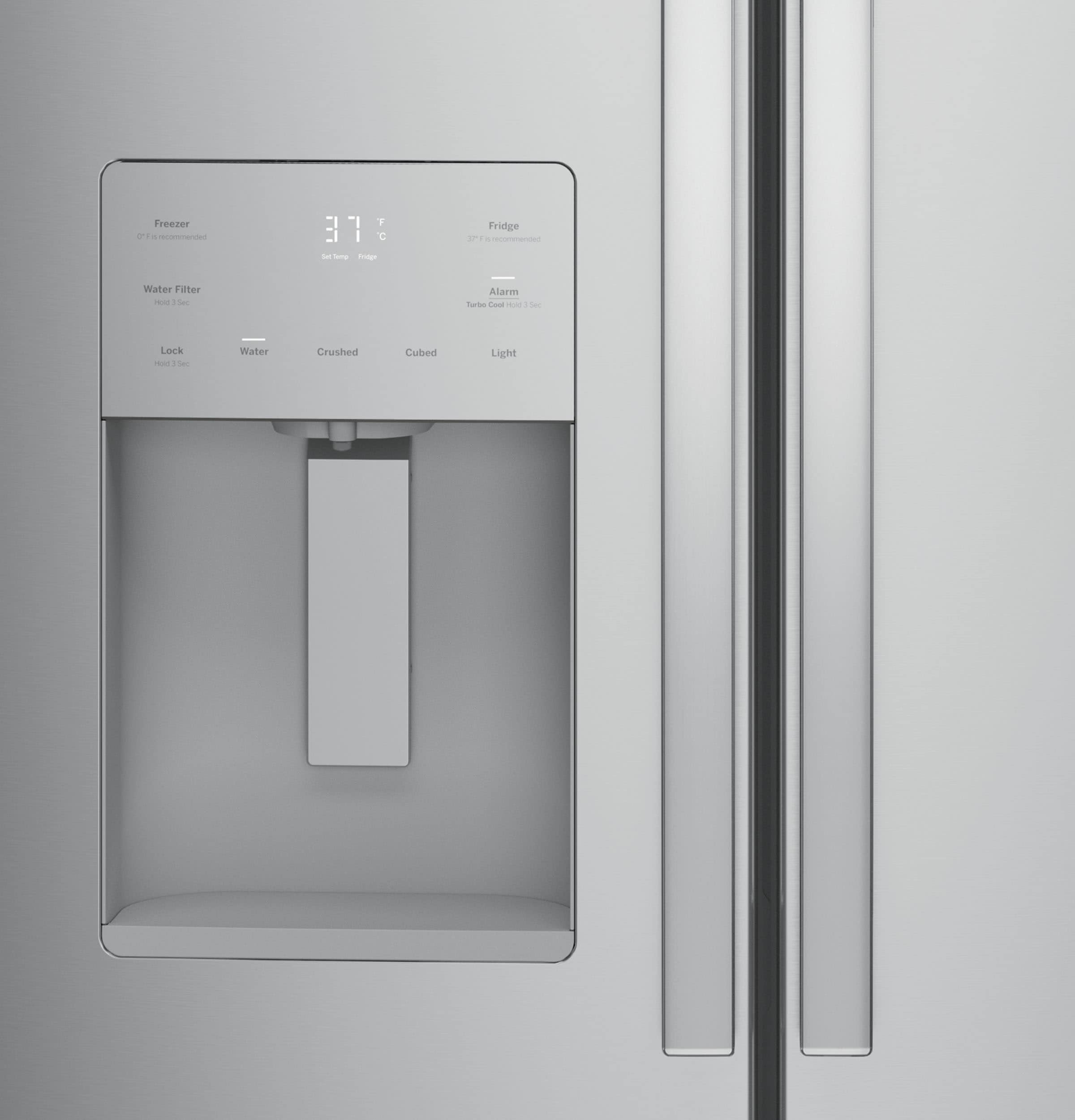External controls with actual temperature display, child lock and door alarm - eliminates the guesswork in setting refrigerator temperatures; conveniently displayed on the dispenser