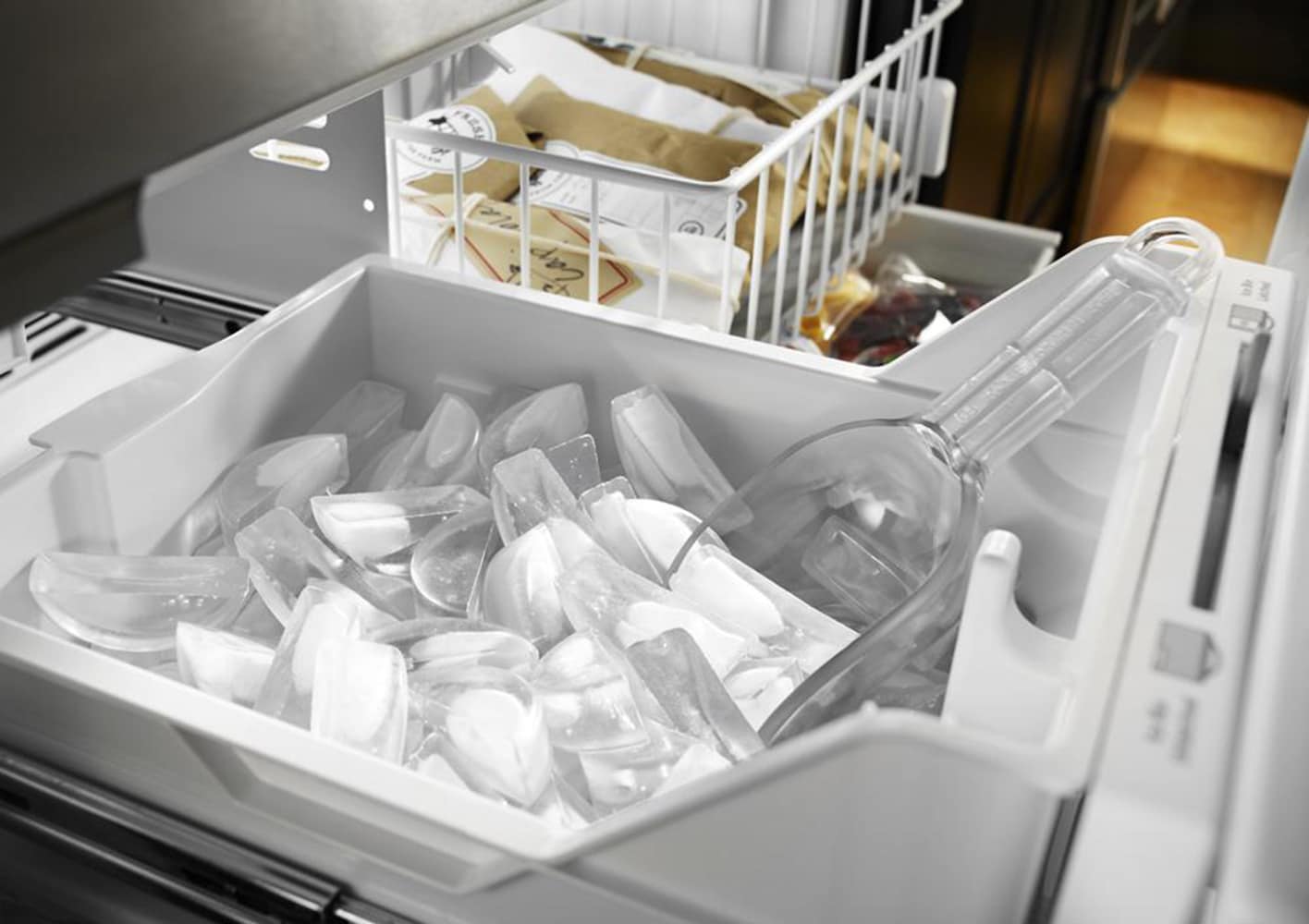 Pull-out tri level freezer drawer features slide-out baskets with mats to help keep the freezer clean and organized