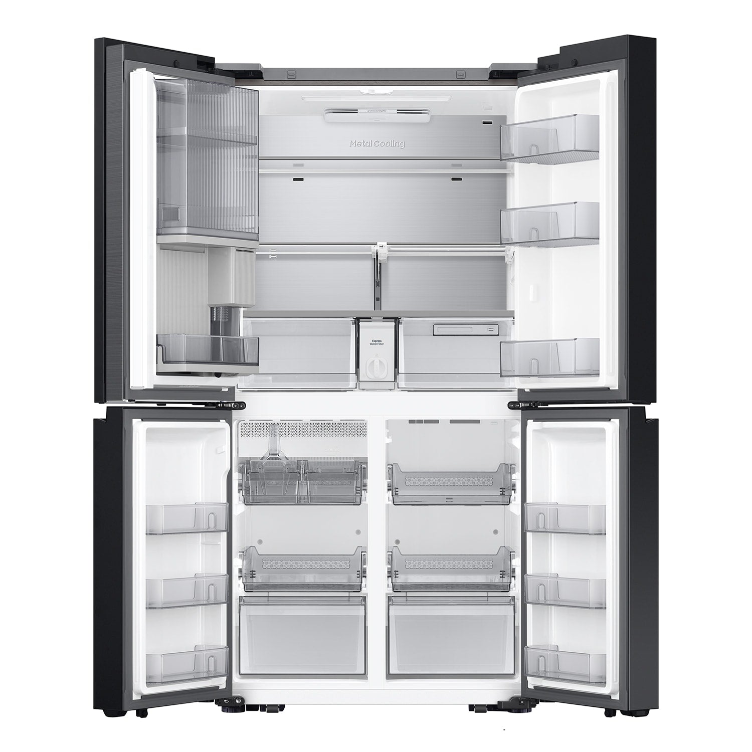 Samsung's Bespoke 4-Door Flex Counter Depth 23 cu-ft Refrigerator features Beverage Zone made for your drink of choice; Choose from two temperature settings for the Beverage Zone, plus get quick and easy access to refreshingly cold water two ways; Open the refrigerator with ease, even if your hands are full with Auto Open Door; With just a light touch of the door sensor, the refrigerator door will open (An automatic closing function is not available; the actual open angle of the doors can be different by the installation circumstances and usage conditions like storing heavy items in the door bins; touch sensors can be turned on/off from the control panel/display, and its default setting is off)