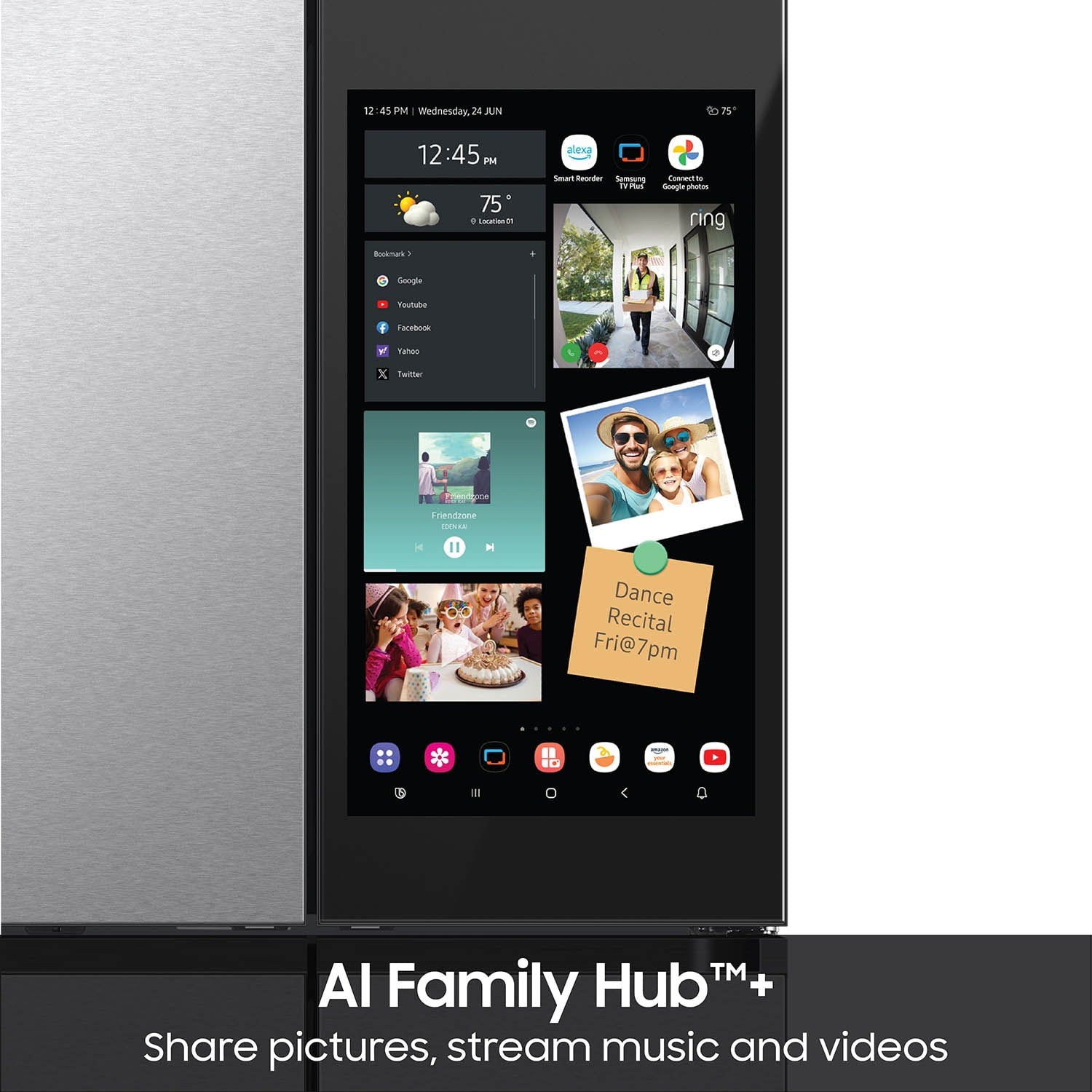 AI Family Hub™+, it's more than a fridge: AI Family Hub™+ features a 32” screen(Refrigerator smart video screen); for an enhanced user experience; It utilizes AI for image recognition and recipe recommendations; Family Hub™+ keeps you connected to your family and home(Wi Fi connection and Samsung account required); Share pictures, stream music and videos, access recipes, control your smart devices and Alexa all from the fridge