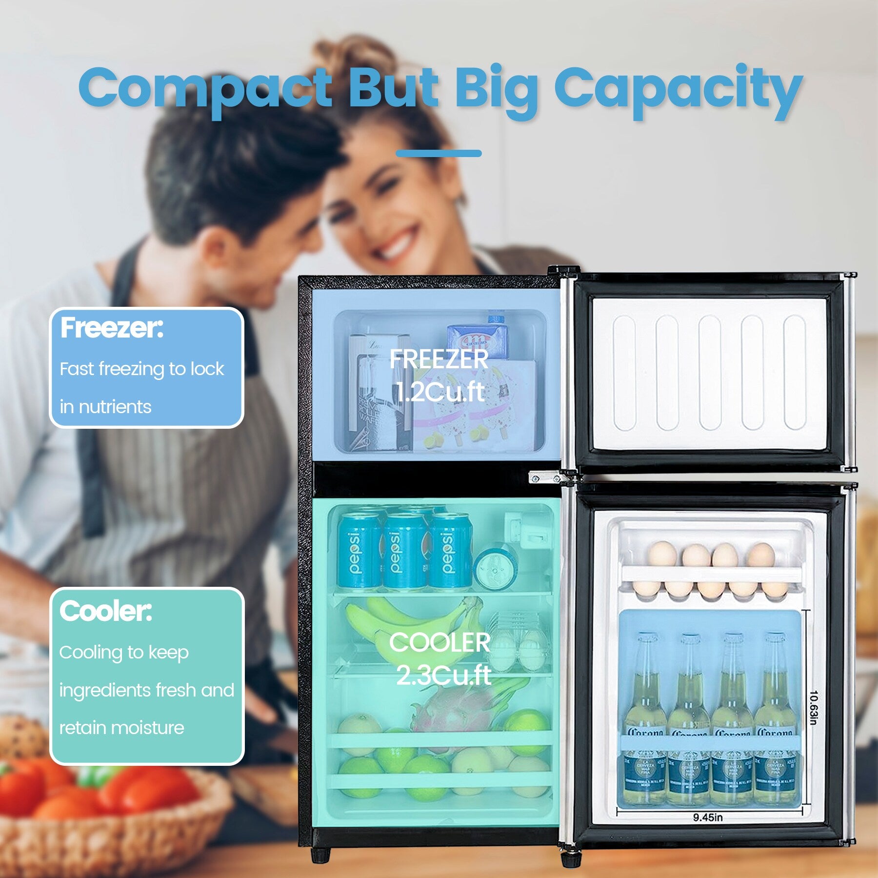 Top freezer design: large capacity of 3.5 cu ft is divided into refrigerator and freezer areas, the fridge has large 2.3 cu ft fresh food capacity for keeping foods organized and 1.2 cu ft freezer capacity for storing frozen foods, which are more spacious than ordinary mini refrigerators and can keep food fresh or frozen.