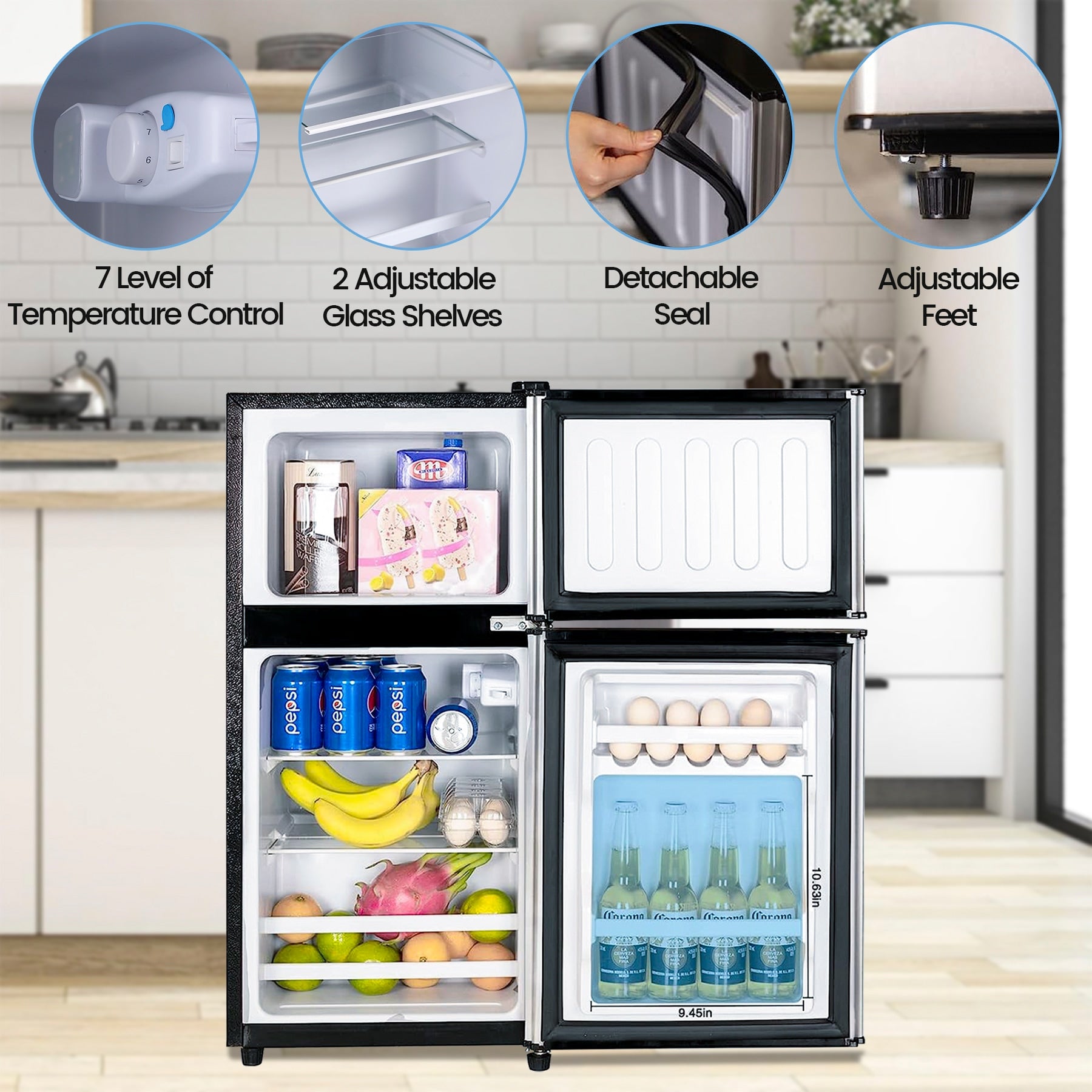 Removable Glass Shelf: The fridge is equipped with two detachable glass shelves, the height can be adjusted according to needs; Flexible storage of food or drinks, easy to take out and clean.