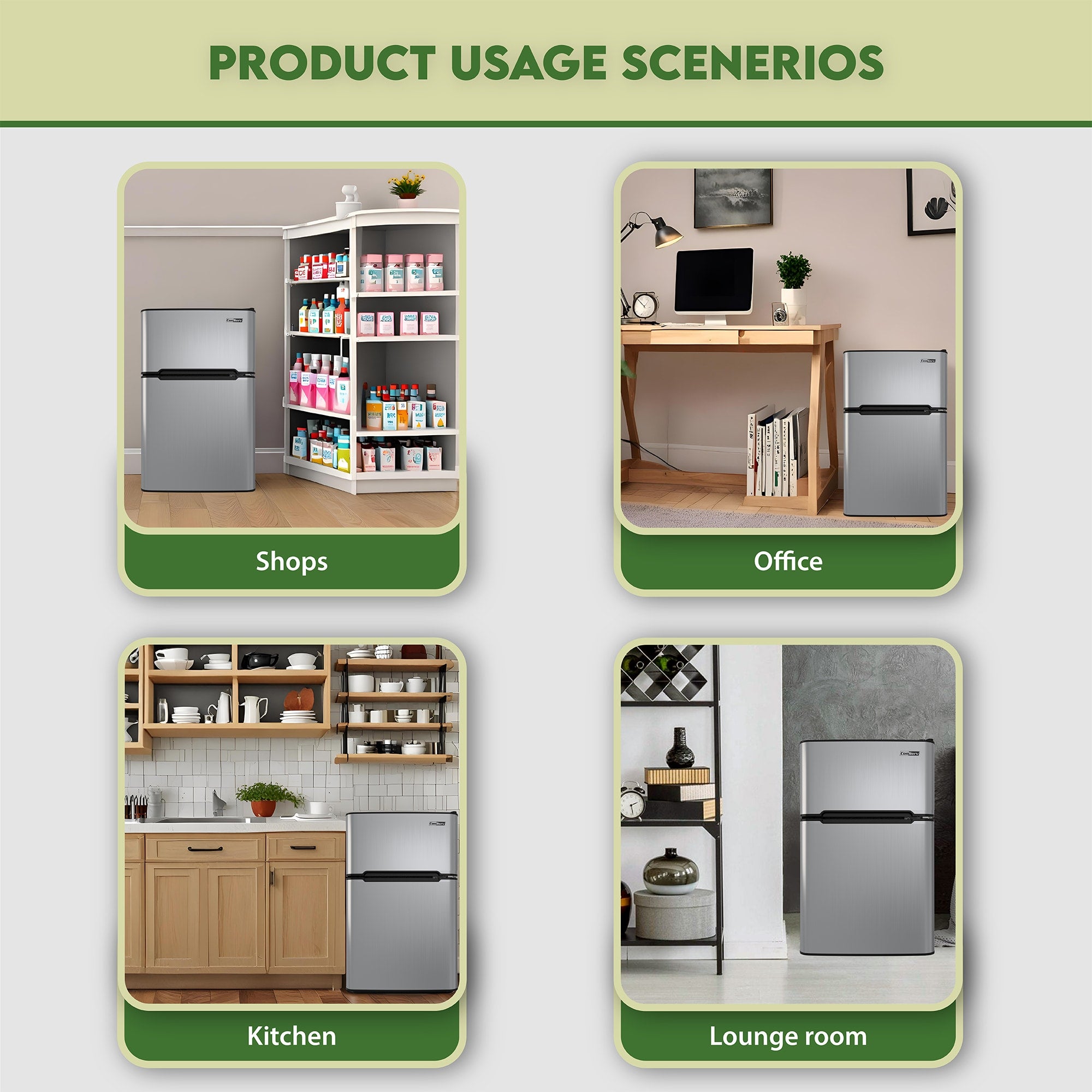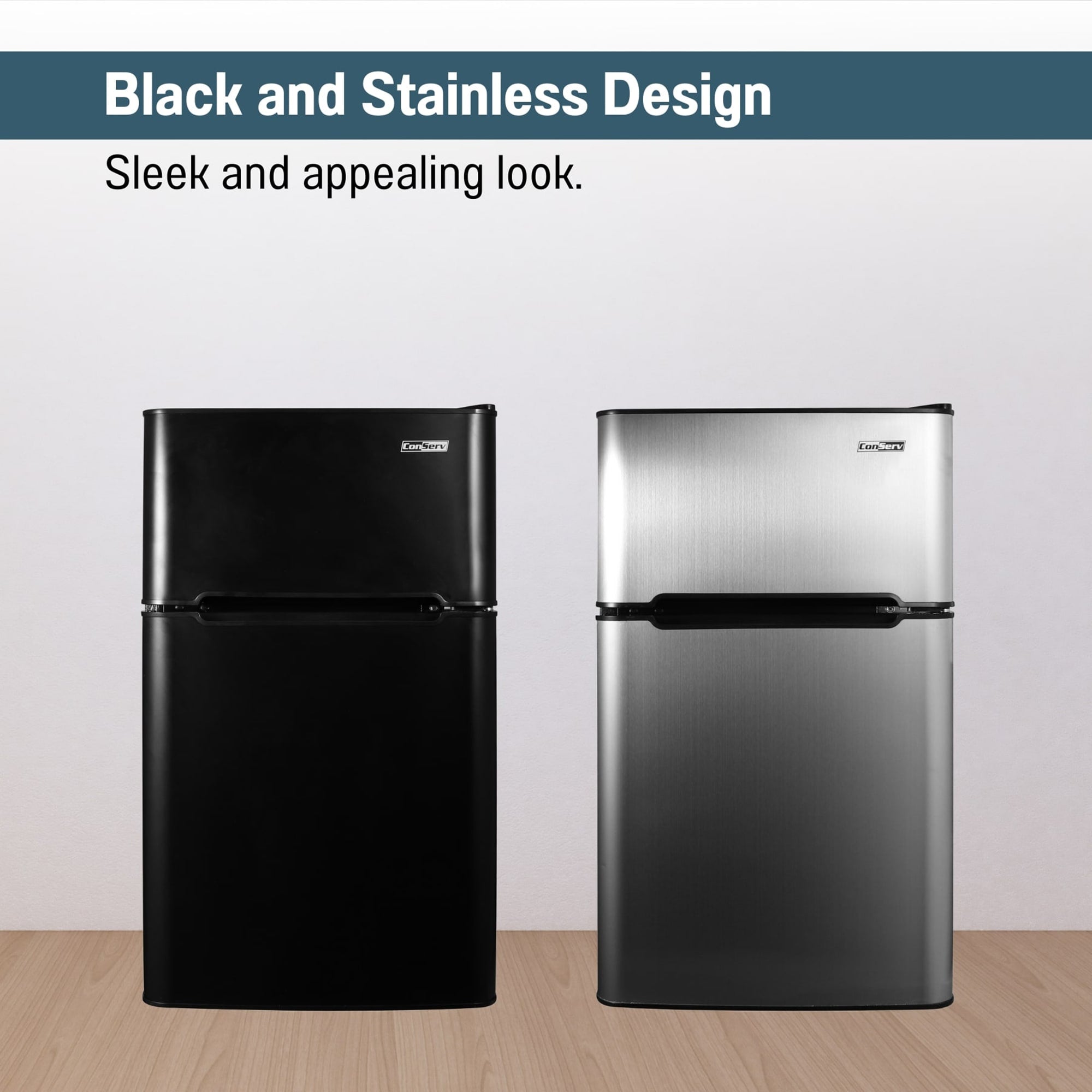 Short on space but in need of ample storage for your favorite foods and beverages? The ConServ 3.20 Cu. Ft. Stainless Compact Refrigerator Freestanding Compressor Cooling is the ultimate cooling solution for small spaces. Measuring 33.5 x 18.9 x 19.9 (HxWxD in inches), and weighing just under 58 pounds, this freestanding appliance can effortlessly be moved between rooms as needed. Inside the refrigerator, there is 2.24 cu. ft. of storage space, and in the freezer, there is 0.93 cu. ft. of room. The unit is powered by reliable, eco-friendly compressor cooling. Easily set the temperature of the refrigerator between 32°F to 50°F, and the freezer between 6.8°F and -4°F. When organizing the contents of the CRF 320, enjoy the convenience of using a crisper tray, two glass shelves, and a wire bottle rack. You can also store up to six cans in the built-in door can dispenser. Other noteworthy features include an interior light, reversible door, adjustable legs, and manual defrosting. UL certified.