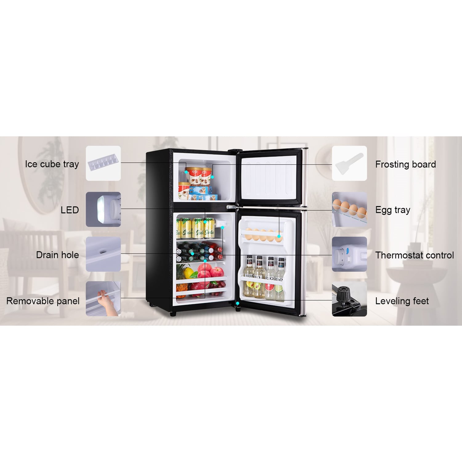 The large capacity of 3.5 Cu Ft is divided into refrigerator and freezer areas, which are more spacious than ordinary mini refrigerators and can keep food fresh or frozen