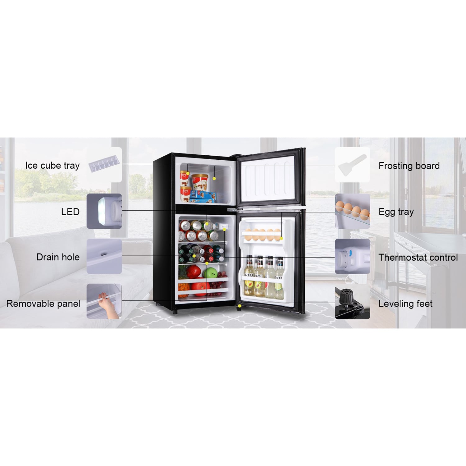 • The large capacity of 3.5 Cu Ft is divided into refrigerator and freezer areas, which are more spacious than ordinary mini refrigerators and can keep food fresh or frozen