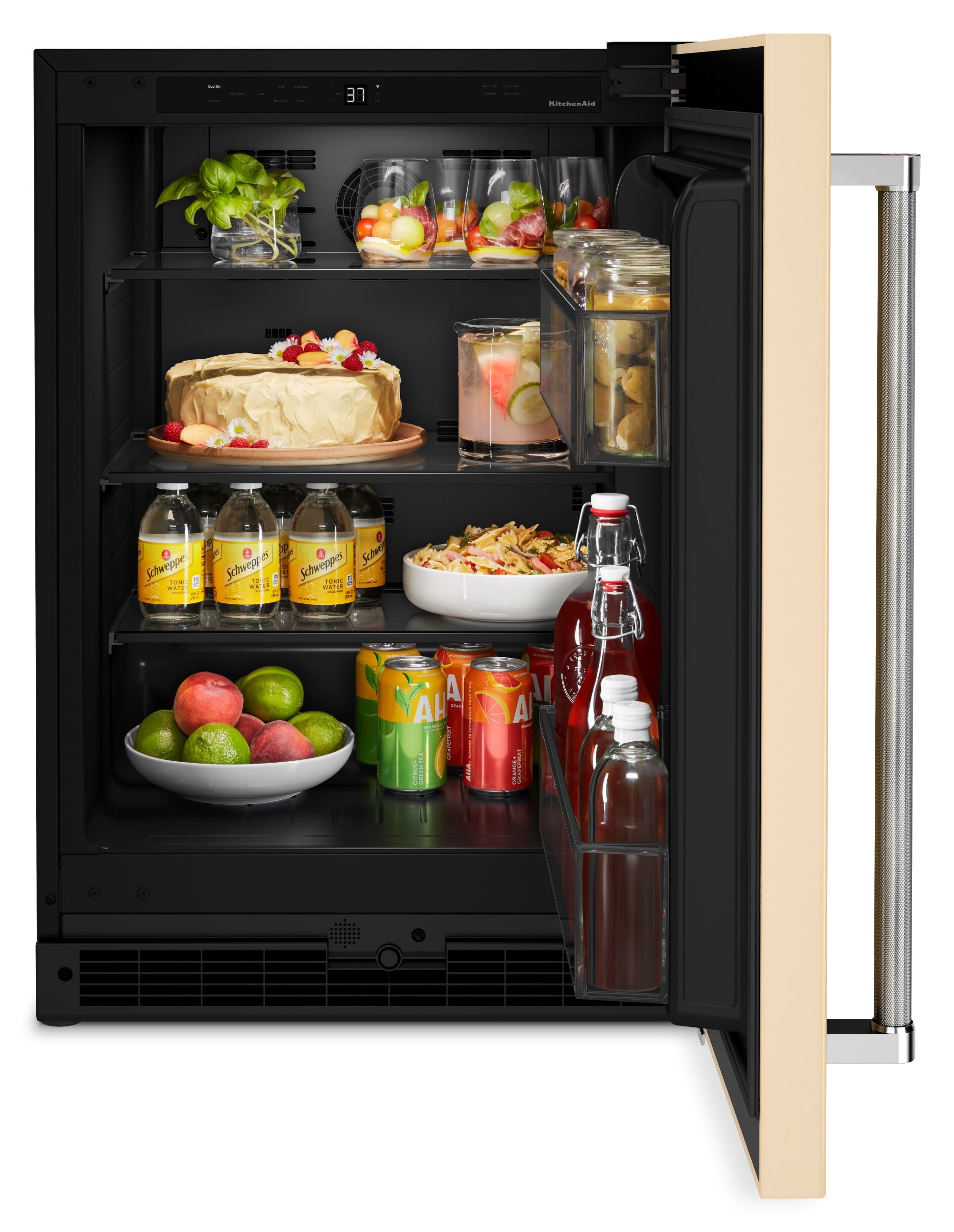 This Undercounter Refrigerator makes room for party essentials from platters to pitchers. LED Interior Lighting turns on when the door is open, making it easy to find items inside, and a Temperature Monitoring System with sensor alert adds peace of mind. Fully Flush Installation with Hidden Hinges provides a built-in look within cabinetry.