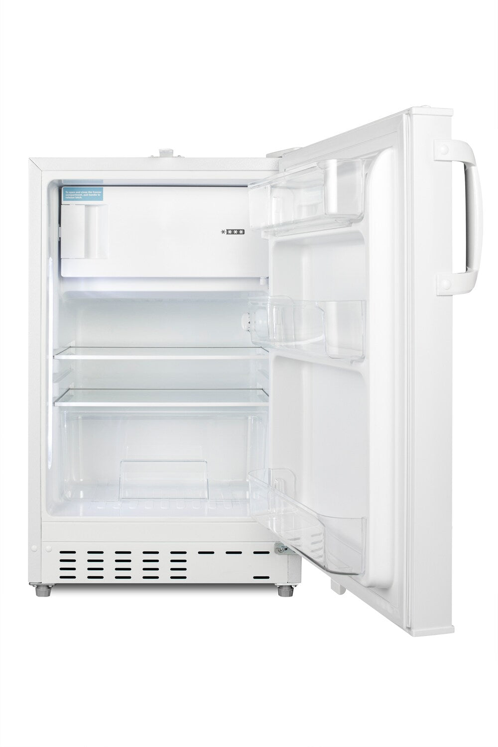 Summit Appliance offers a wide range of built-in undercounter refrigerator-freezers designed for installation under lower ADA compliant counters, with advanced features for user convenience.The ALRF48 is sized at 32" high to fit under lower counters complying with ADA guidelines for accessibility. The fully finished textured white cabinet allows freestanding use, while the front-breathing system means this unit can be built-in with minimum clearance. The user-reversible door is 3" thick for efficient insulation, with a handle included for added convenience. This unit comes with a right angle cord to allow for easier placement without added depth. A factory-installed lock is conveniently located towards the top of the door to provide security as needed. Inside, the ALRF48 features an all-white interior for easy cleaning and viewing of contents. Static manual defrost operation provides efficient cooling inside the 2.68 cu.ft. interior, while the dial thermostat makes temperature management simple. An automatic LED light located toward the front of the unit attractively illuminates the interior when the door opens. Three spill-proof adjustable glass shelves offer flexible storage options for large and small items, while a pull-out crisper drawer provides storage for fruits and vegetables. Three removable door racks accommodate additional storage as needed. This unit includes a compact freezer compartment with a cover. With its compact size and convenient features, the ALRF48 is the perfect unit for offices, dormitories, and other residential settings in need of an easy-fitting refrigerator-freezer.