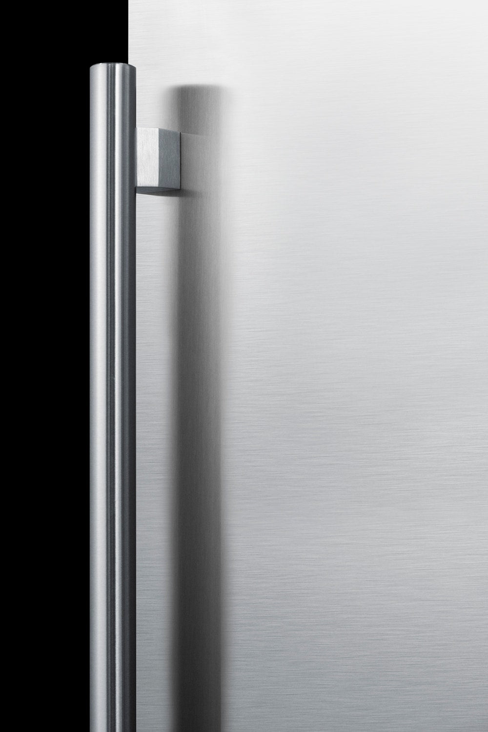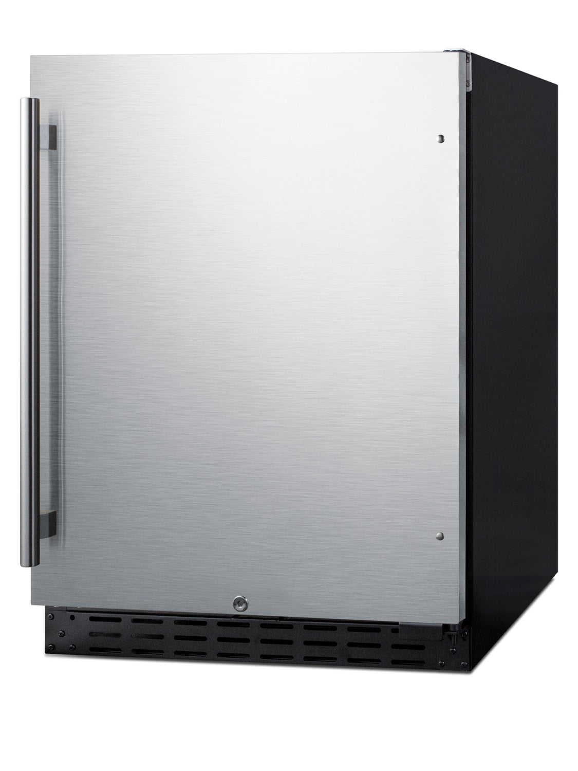 SUMMIT features built-in undercounter all-refrigerators designed for installation under lower ADA compliant counters, with advanced features for user convenience.The AL55 refrigerator is ETL-S listed to NSF-7 for commercial use and also meets residential standards. The front-breathing design allows built-in installation, while the fully finished black cabinet also enables freestanding use. Sized just under 32 inches high and 24 inches wide, this unit makes an ideal fit under lower ADA compliant counters. The user-reversible door comes in a stainless steel finish with warm undertones and vertical grain, and a pro style handle provides a professional, elegant look for any setting. A temperature alarm offers added security should the temperature go beyond the setpoint, and the optional Sabbath Mode can be used to disable certain electrical features during periods of religious observance. The automatic defrost system keeps the unit running efficiently with little user maintenance, and the internal fan ensures the unit is evenly cooled. Inside, the AL55 has a digital control panel which allows you to manage the unit’s temperature with ease. An adjustable temperature range between 36 and 46ºF ensures contents are kept cold. Three easy-glide glass shelves that extend 50% provide flexible storage, and the shelving brake system keeps unit contents safe when loading and unloading. Two door racks are ideal for keeping condiments within easy reach, while the slotted floor ensures easy storage of bottles. The dimmable soft LED lighting in a gentle blue hue with three brightness settings offers an attractive and efficient presentation inside the white interior.With its advanced user features and versatile design, the AL55 is an excellent addition to any ADA compliant setting looking for a refrigerator with a modern, elegant look.