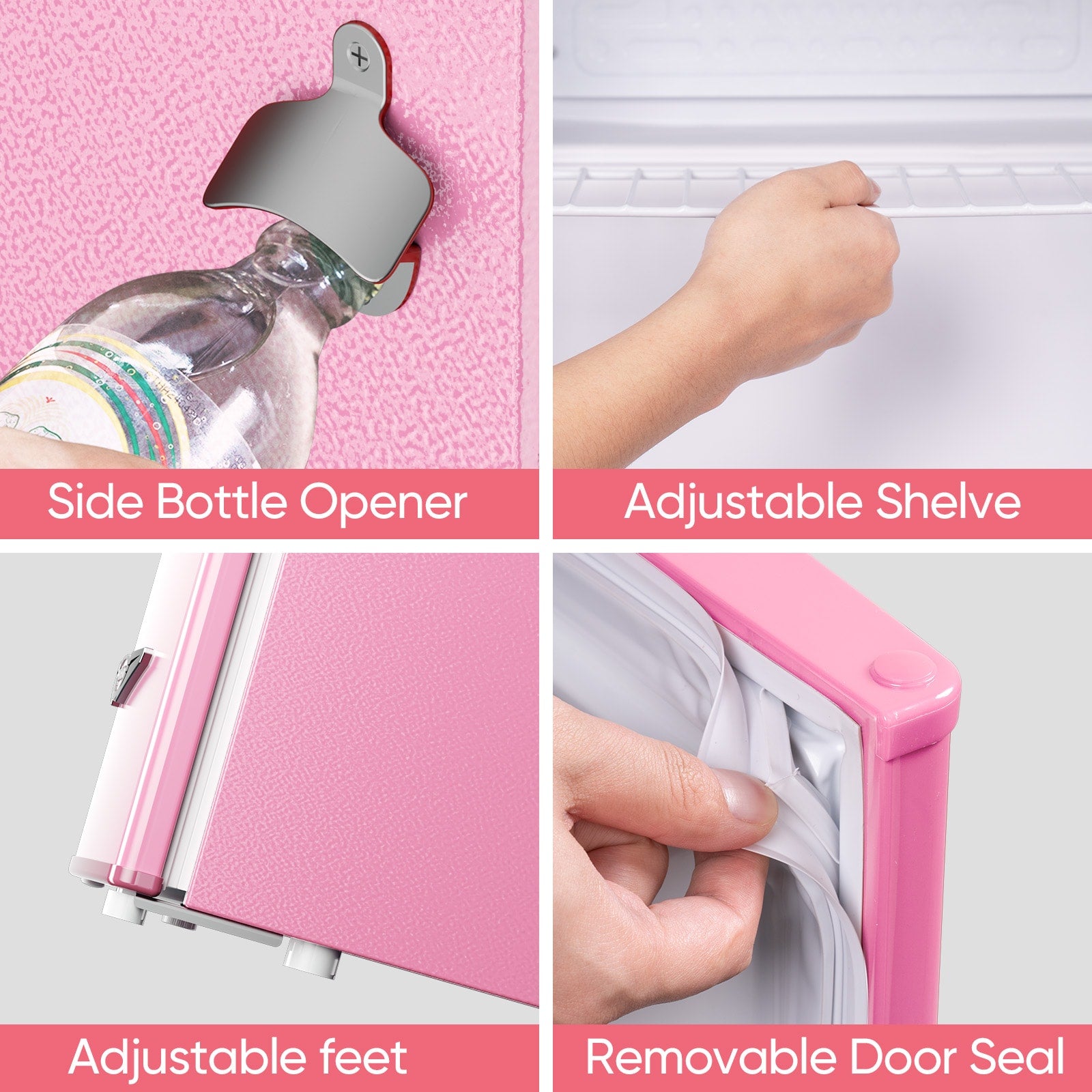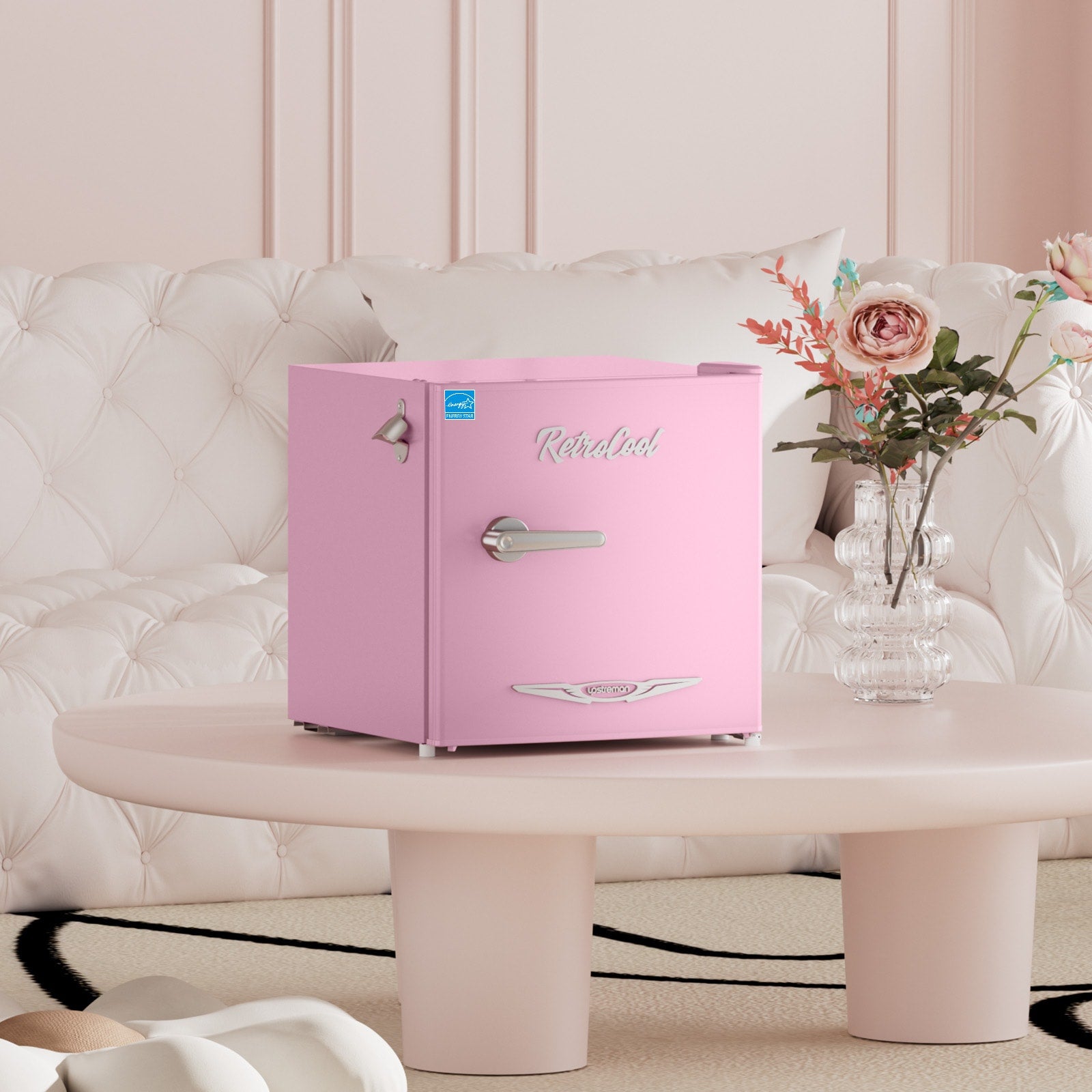 Featuring a classic exterior with metal handle and side bottle opener, the overall appearance of this retro refrigerator is stylish and high texture.