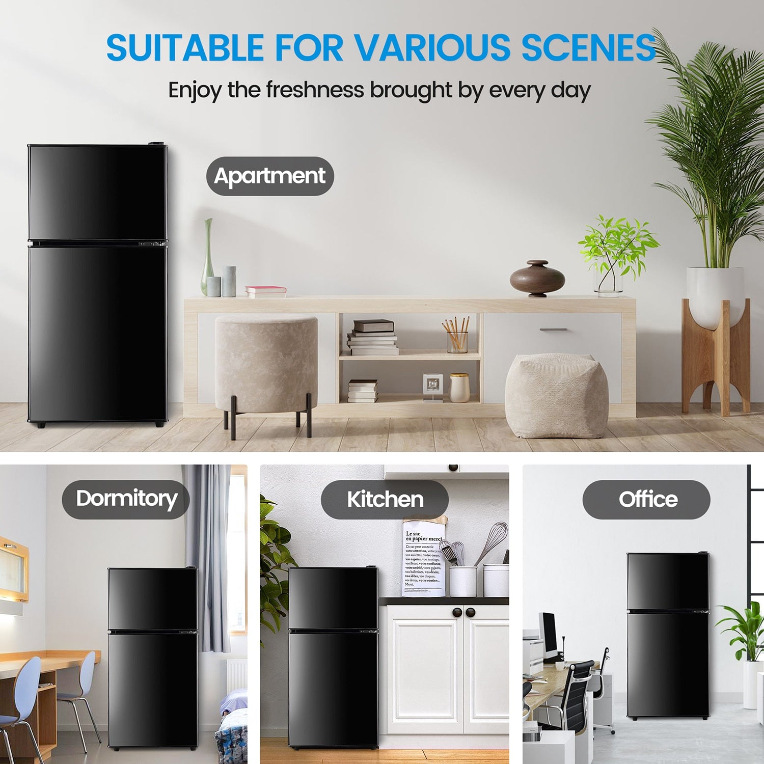 Two Door Design: This refrigerator has large capacity of 3.5 cu ft (1.2cu-ft freezer and 2.3cu-ft cooler) with dual door design.