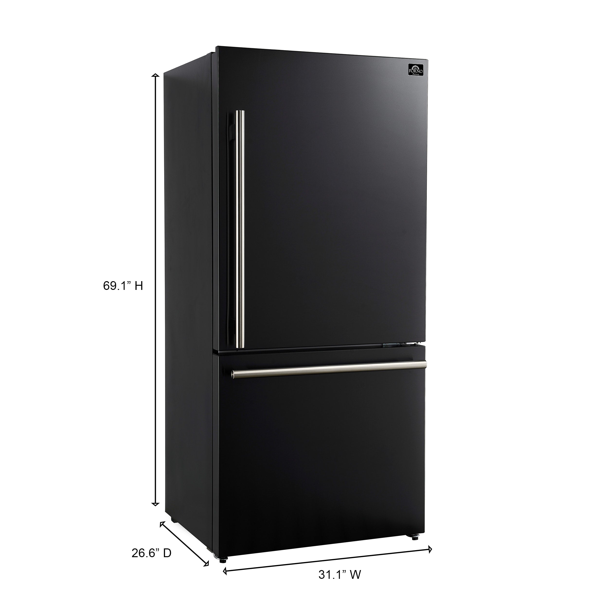 Introducing the FORNO 31 Inch Milano Espresso Bottom Freezer Refrigerator that seamlessly blends style and functionality. Its compact 31 Inch size and 17.2 cu ft capacity offer ample storage without compromising aesthetics. Two full-width freezer drawers optimize organization, while digital touch control ensures precise temperature settings and real-time monitoring. The black finish door maintains a modern look effortlessly. Swift temperature adjustment with Super Cool and Super Freeze safeguards your groceries quality. ENERGY STAR Certified for efficiency, and high-efficiency LED lighting reduces food spoilage. Antique brass handles add an elegant touch, and adjustable features, including shelves, door bins, and a full-width crisper drawer, enhance user-friendliness. Upgrade your kitchen with style, convenience, and freshness!