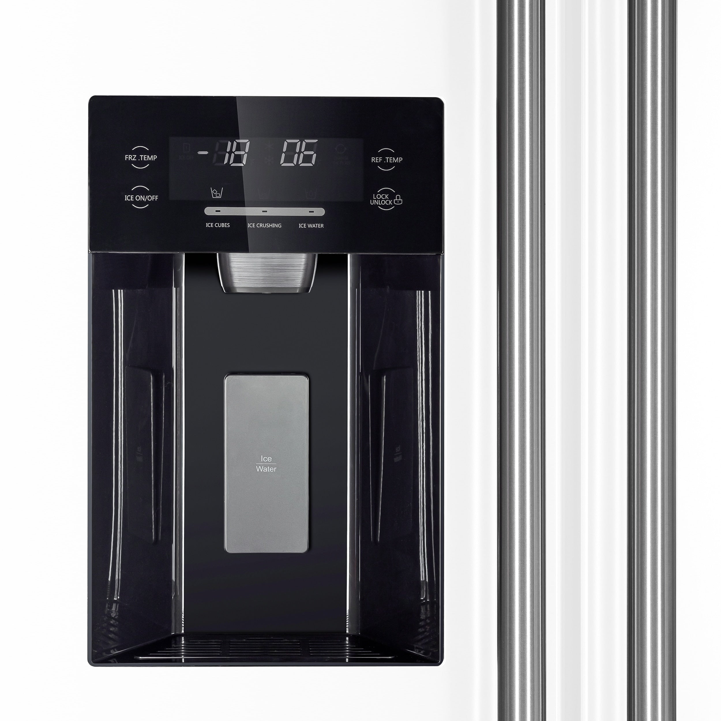Door dispenser that gives you the option of ice cubes, ice crushing and ice water.