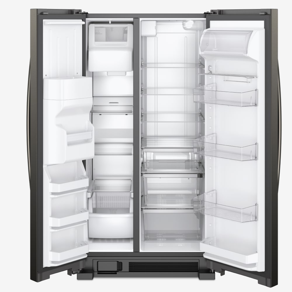 Enjoy purposefully designed storage spaces for the items your family uses the most. This Whirlpool® 25 cu. ft. Side-By-Side Refrigerator is designed with features to help you fit and find your favorite foods, like an in-door Can Caddy, Frameless Glass Shelves that offer greater storage flexibility and a Deli Drawer. This model also allows access to fresh filtered water and ice without ever opening the refrigerator door. Whirlpool® Side-by-Side Refrigerators have the lowest repair rate among side-by-side refrigerators. (*Claim compares Whirlpool branded refrigerators to GE, Frigidaire, Samsung and LG.Based on service required data, Q2 2022-Q2 2023, Traqline - The Stevenson Company, 2023.)