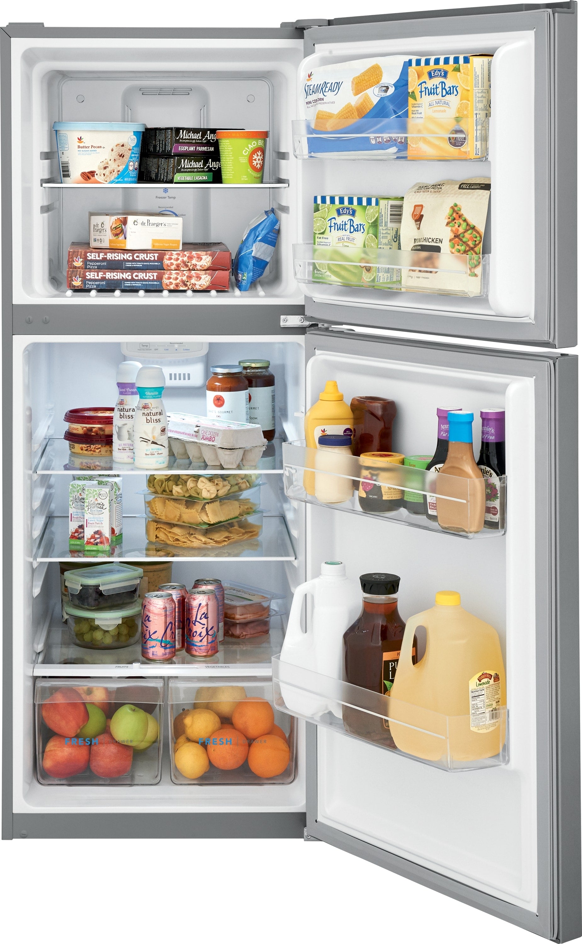 The Frigidaire 10.1 cu. Ft. apartment-size top freezer refrigerator has adjustable shelving and humidity control crisper drawers for storing fruits and vegetables. It is also equipped with bright lighting to keep contents clearly visible. E-star certification saves on energy costs and reversible doors and rear rollers accommodate your installation needs.