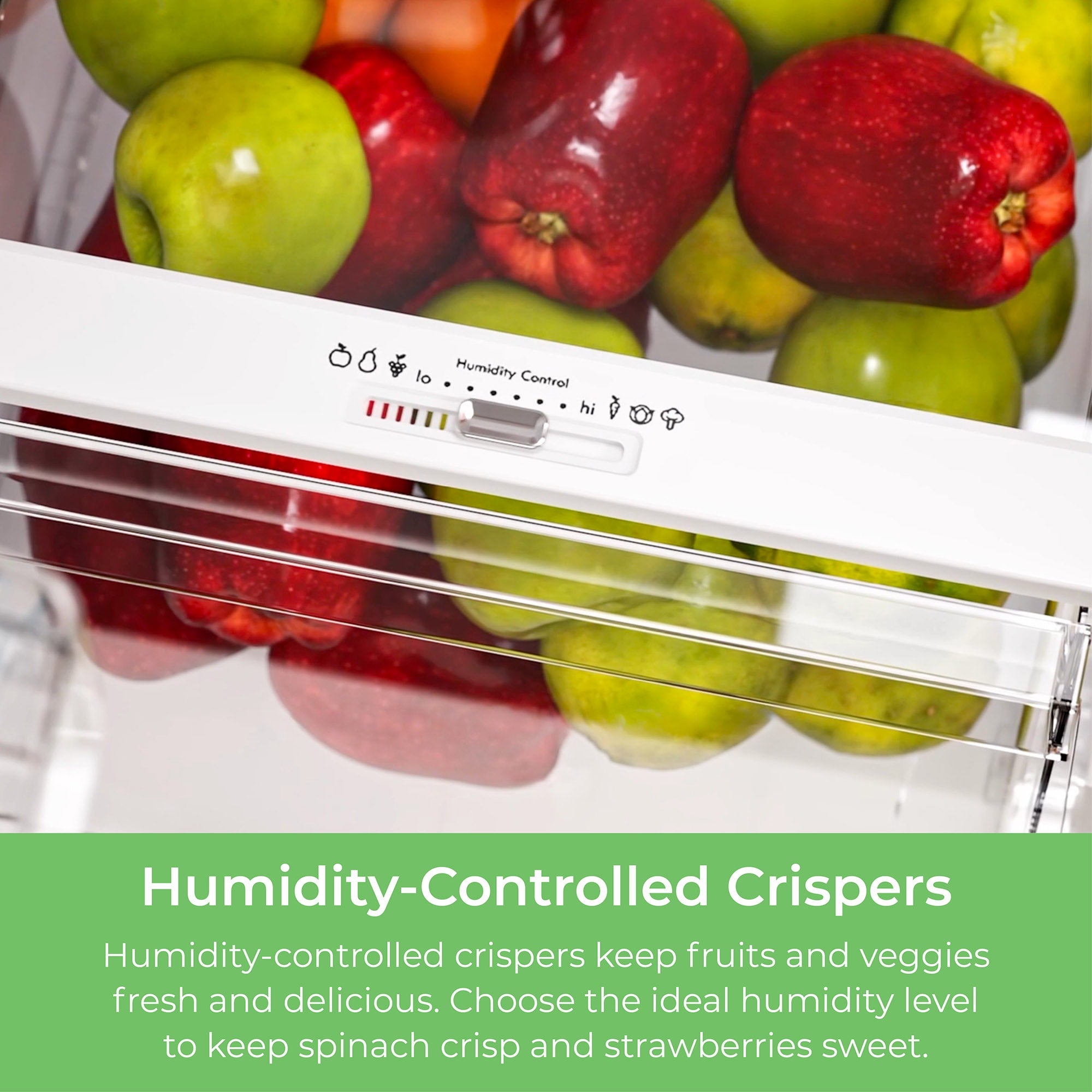 • Clear humidity-controlled crisper drawers keep fruits and veggies fresh