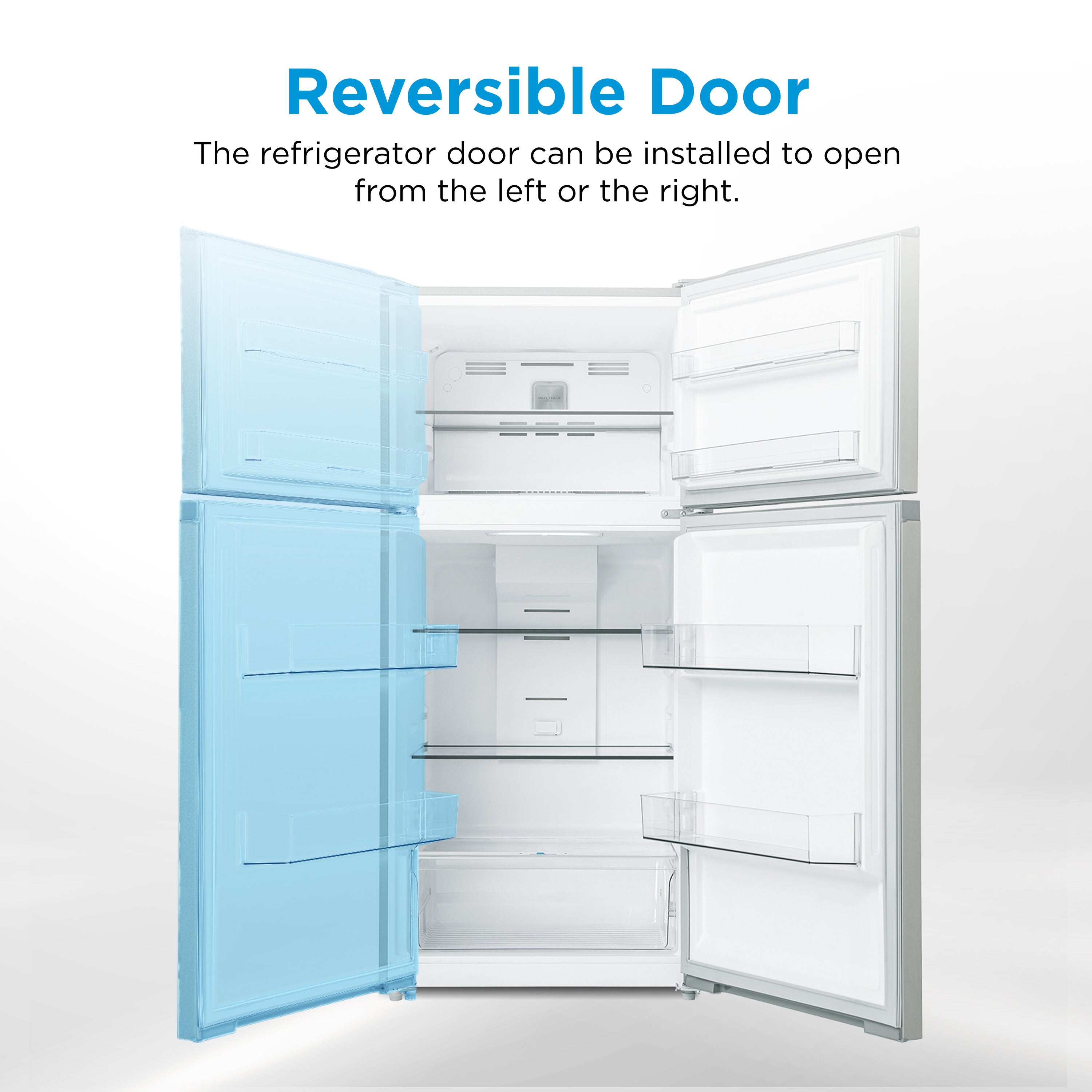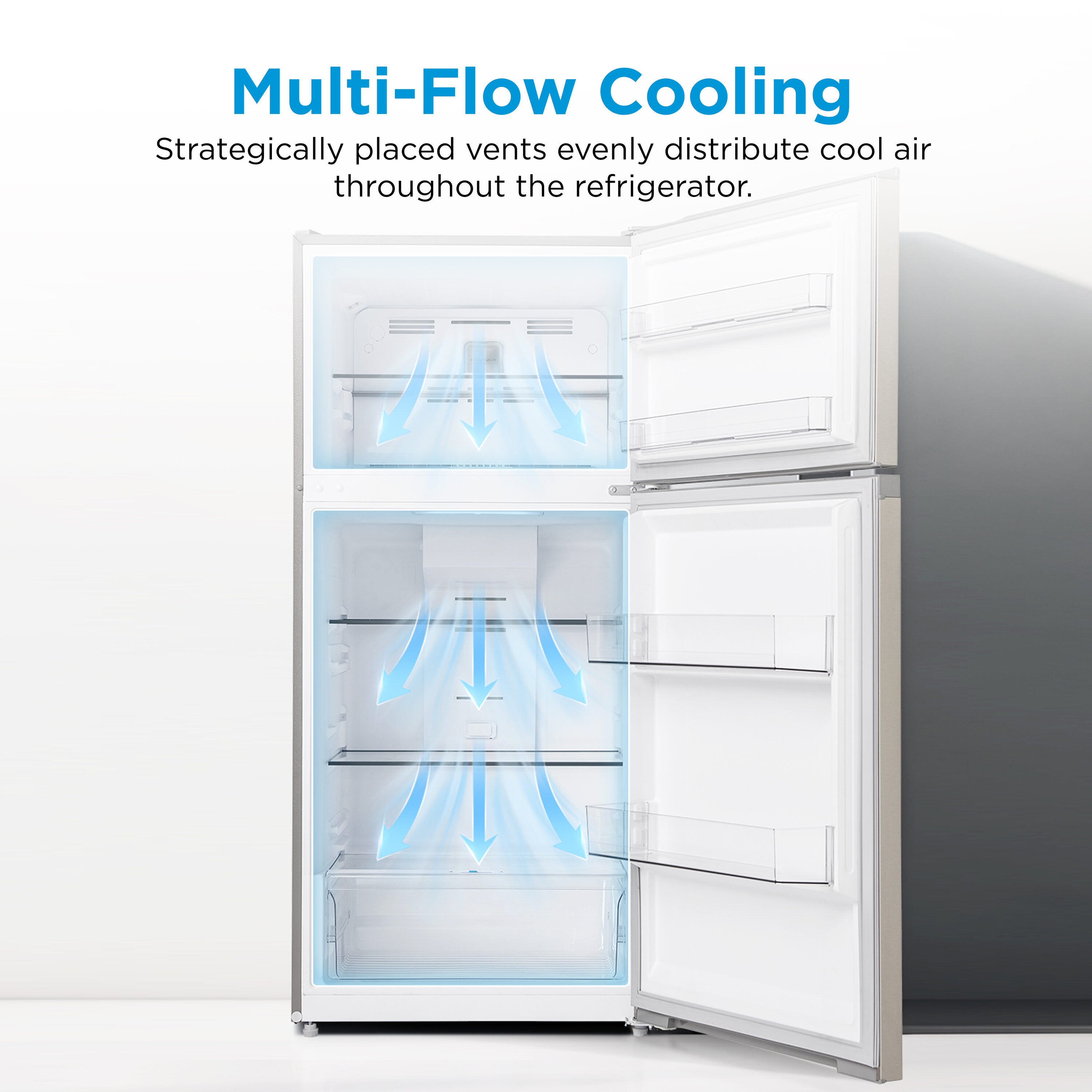 • Multi-Flow Cooling Design: Strategically placed vents evenly distribute cool air throughout the refrigerator, ensuring that ideal temperatures are maintained in every interior space.
