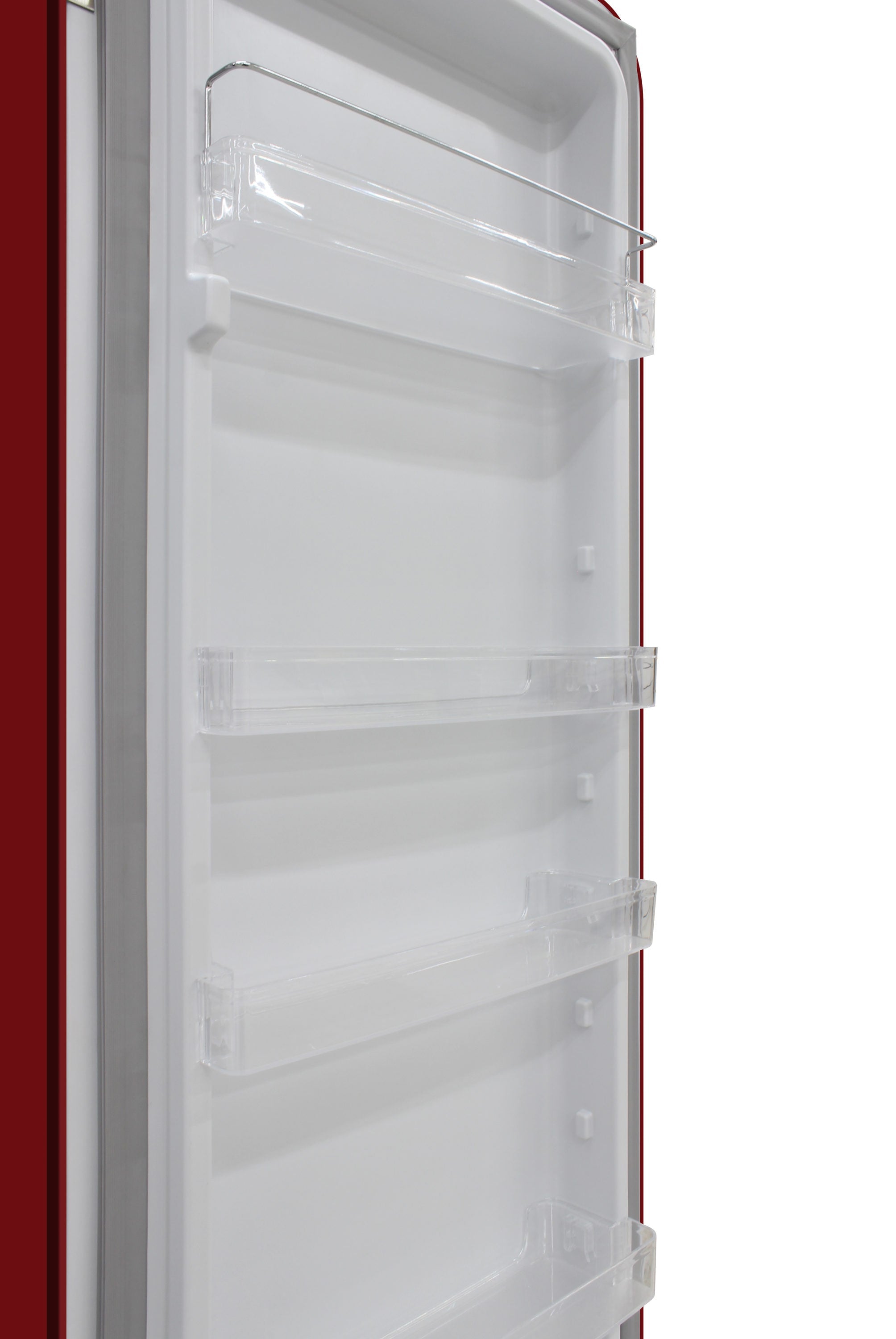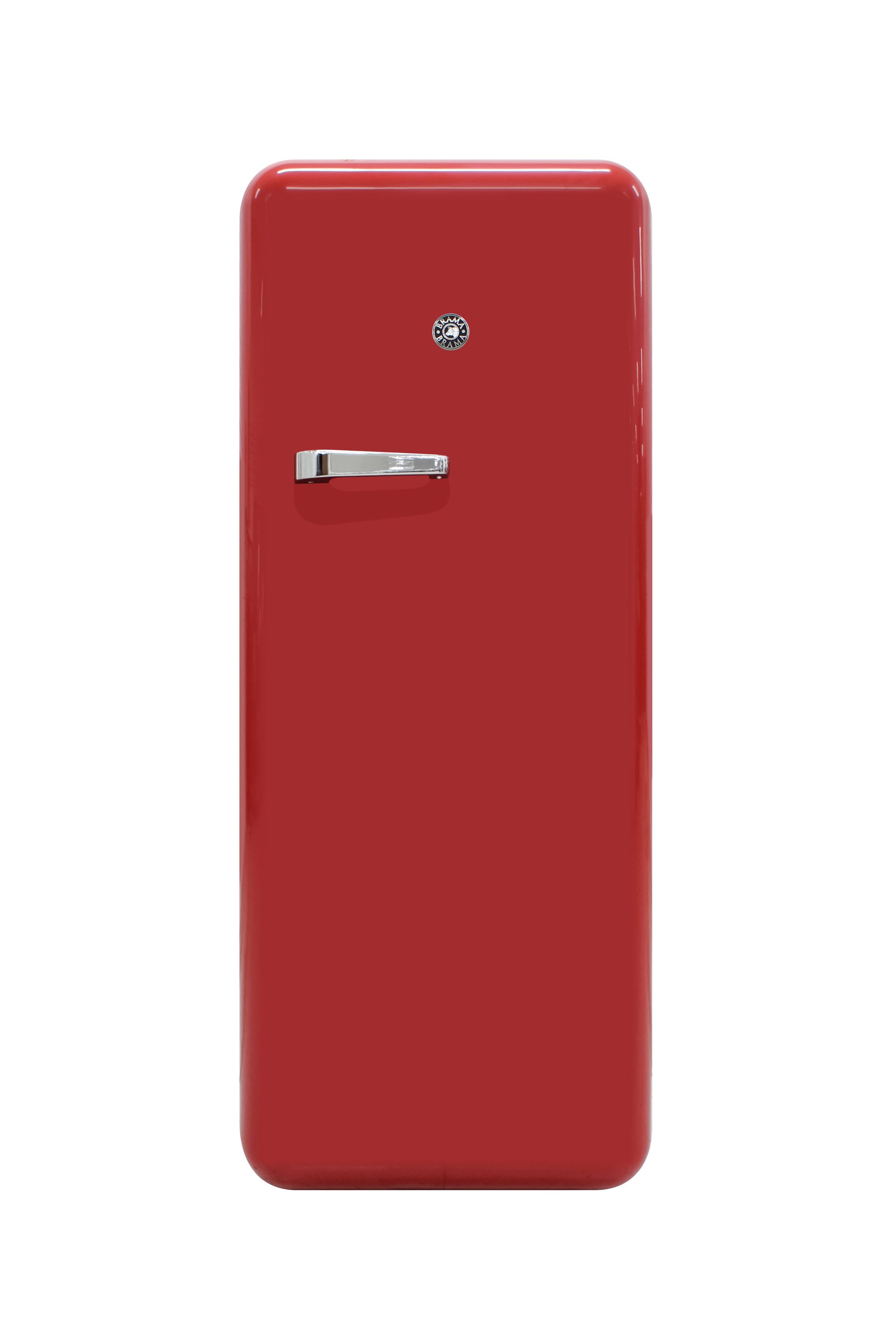 Keep all of your goods at the perfect serving temperature with the Brama Retro Refrigerator. This unit features a top freezer, interior light, open storage with 4 pull-out shelves including one metal wire racking, bottom bulk storage, and 4 rows of small storage behind the door. The red, rounded exterior with solid steel door gives a retro and modern look and makes a perfect addition to to any space.