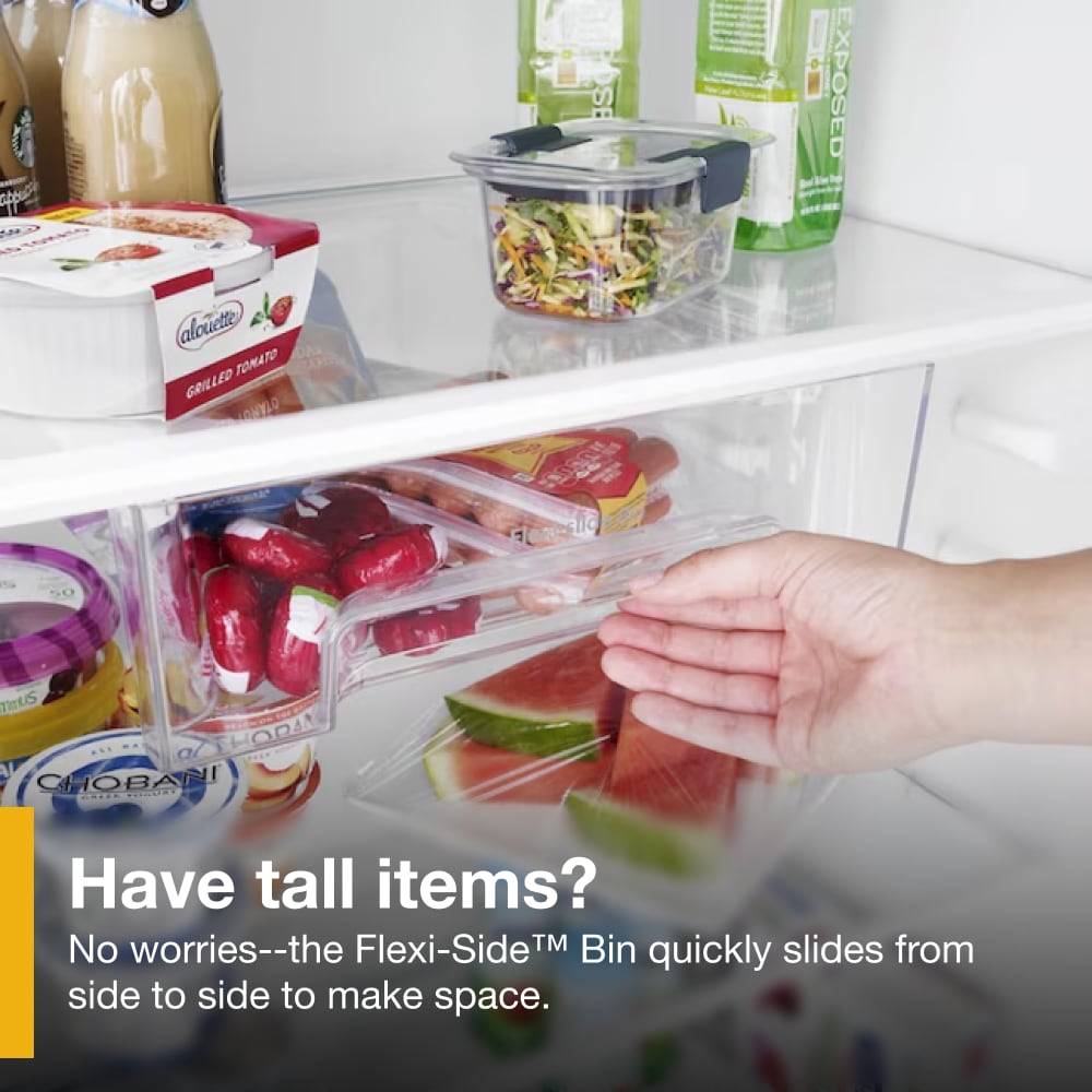 • Storage bins you’ll use every day: one for dairy and a flexible one that moves side to side