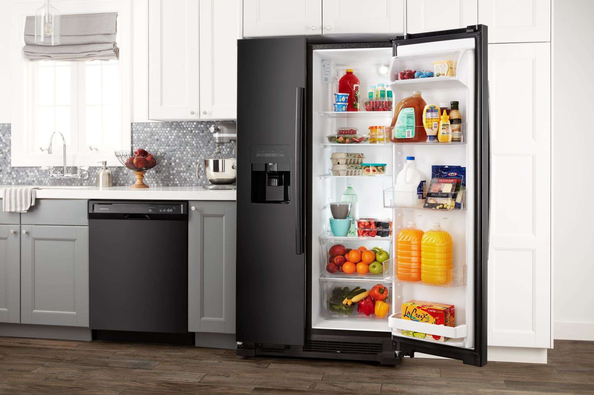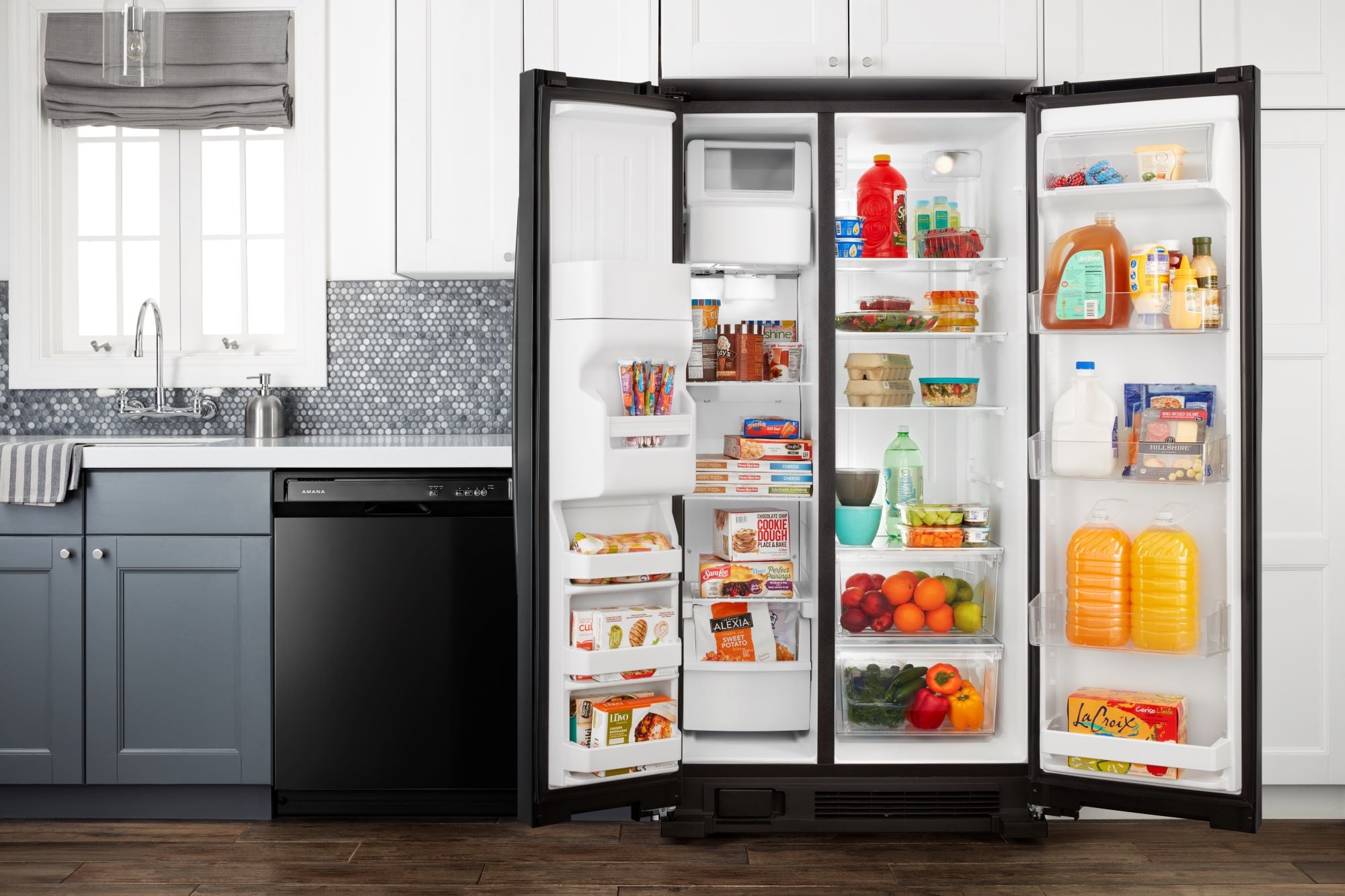 Our 33-inch Amana® Side-by-Side Refrigerator is great for smaller spaces, giving you the right amount of storage room. This 21 Cu. Ft. refrigerator with ice and water dispenser lets you grab fresh H2O with a Dual Pad Dispenser with EveryDrop™ Water Filter. Easily set temps with Electronic Temperature Controls. And big items fit in the Gallon Door Storage Bins.