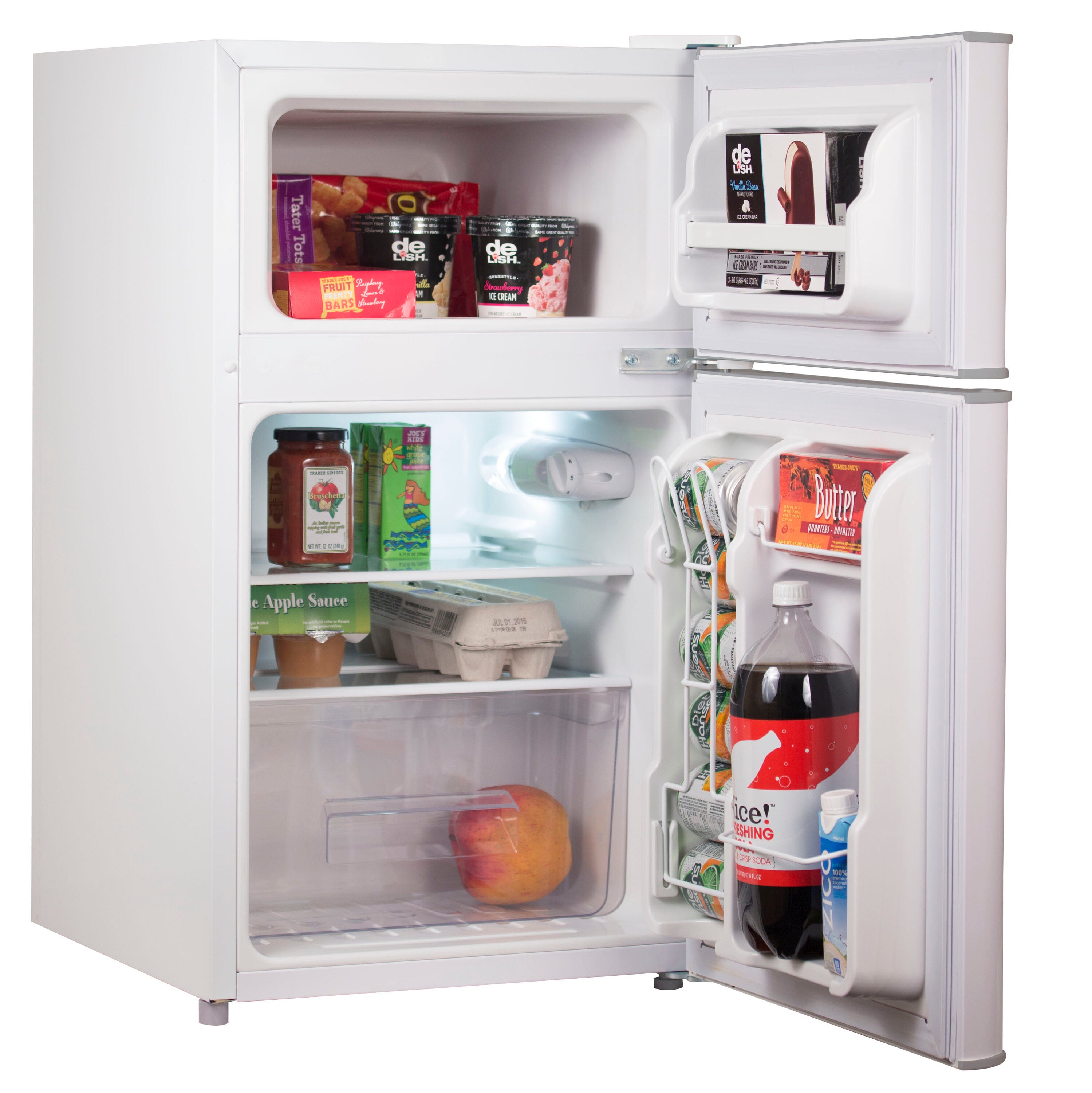 The mini fridge has a modern 2 door design that fits with style into any indoor living space. Adding convenience to any room for real-life practicality, it is perfectly compact without compromising interior storage space. You will be amazed by how much it fits. The free standing, flat back unit fits easily under counters and desks, or in room corners. The adjustable temperature control, 2 removable glass shelves, reversible door, and quiet operation make daily life a lot easier with one small appliance.
