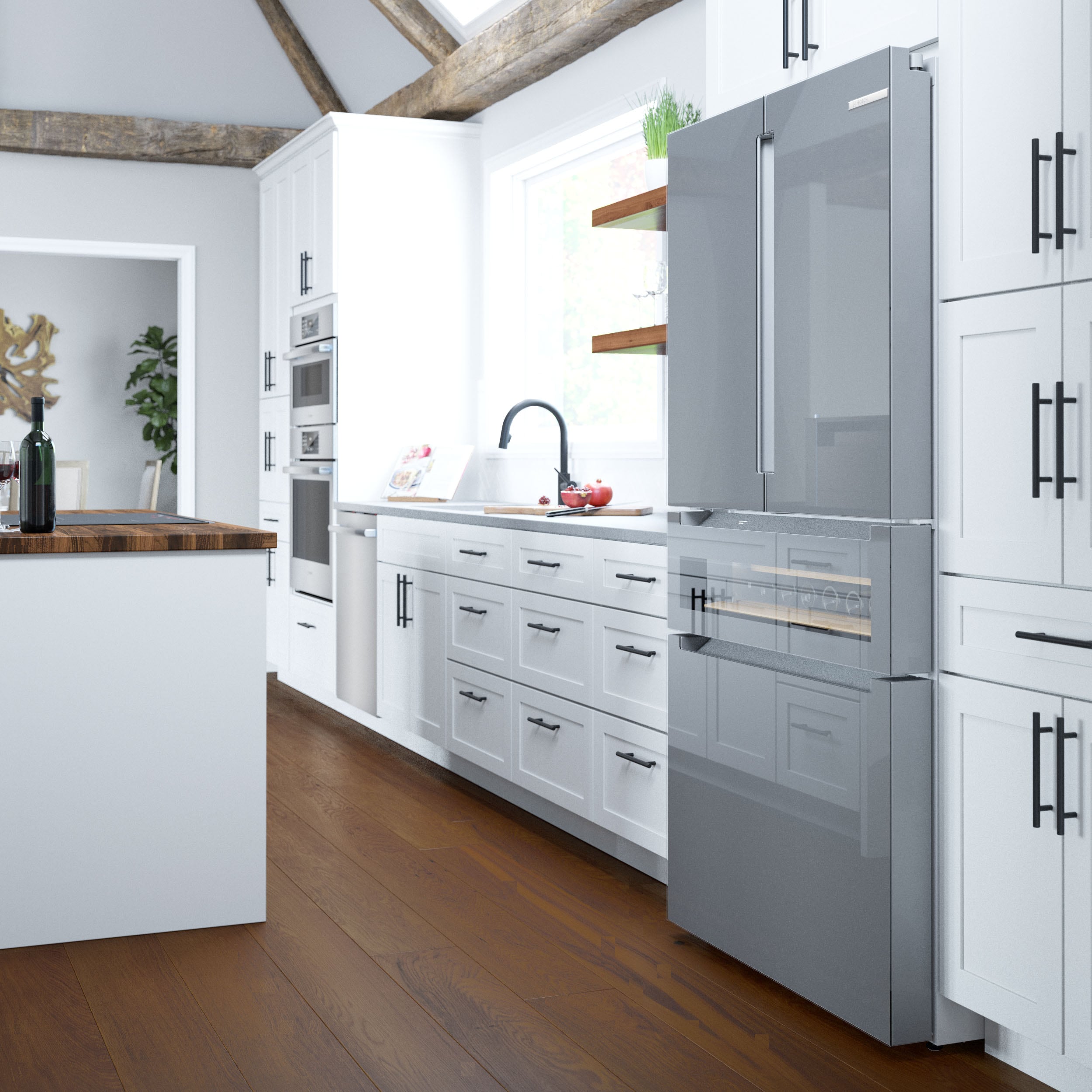 An ingenious three-tier layered freezer drawer system creates extra storage for frozen items, while the advanced ice maker creates pyramid-shaped ice that is fully accessible via a pull-out bin and ice scoop