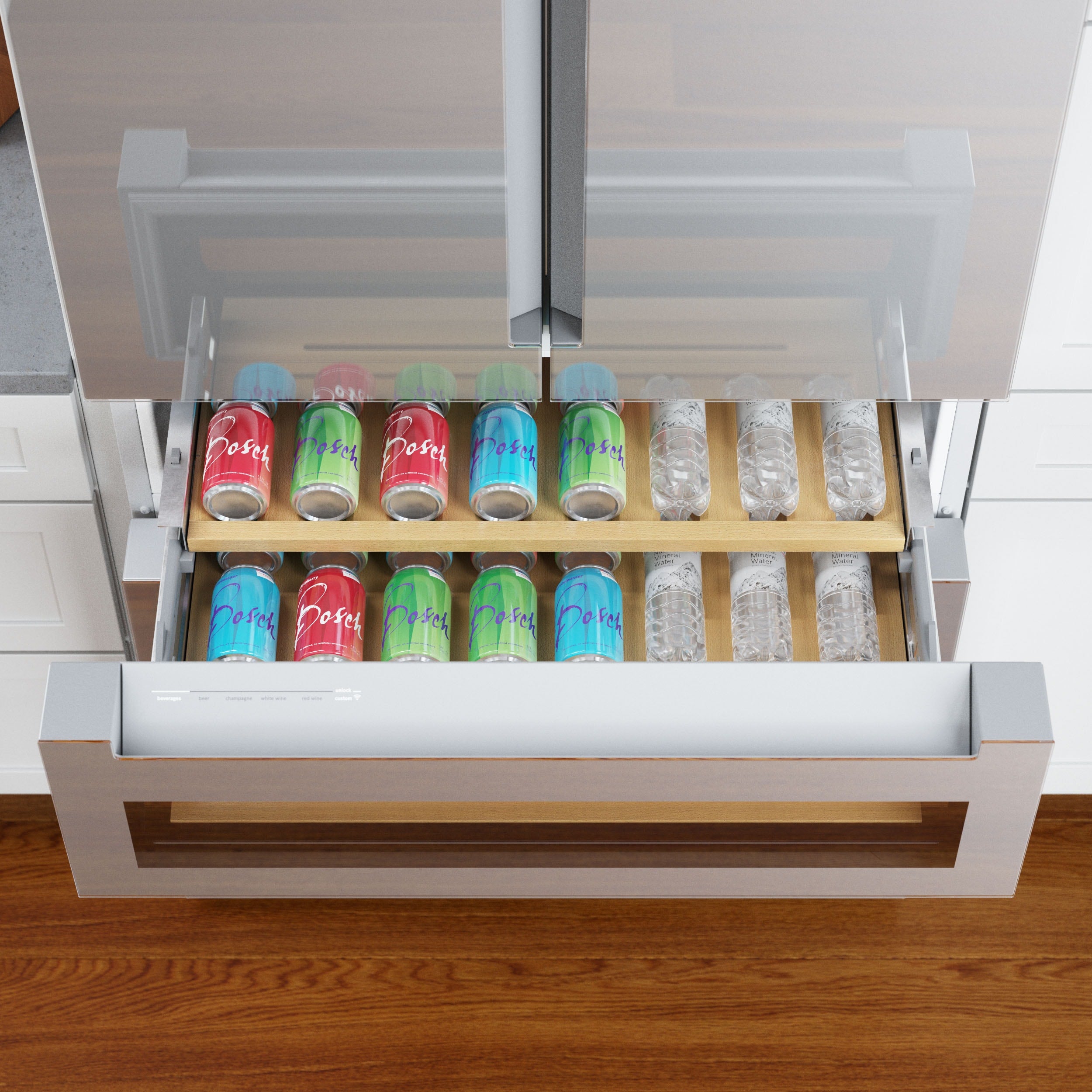 Glass display drawer holds up to 17 standard wine bottles