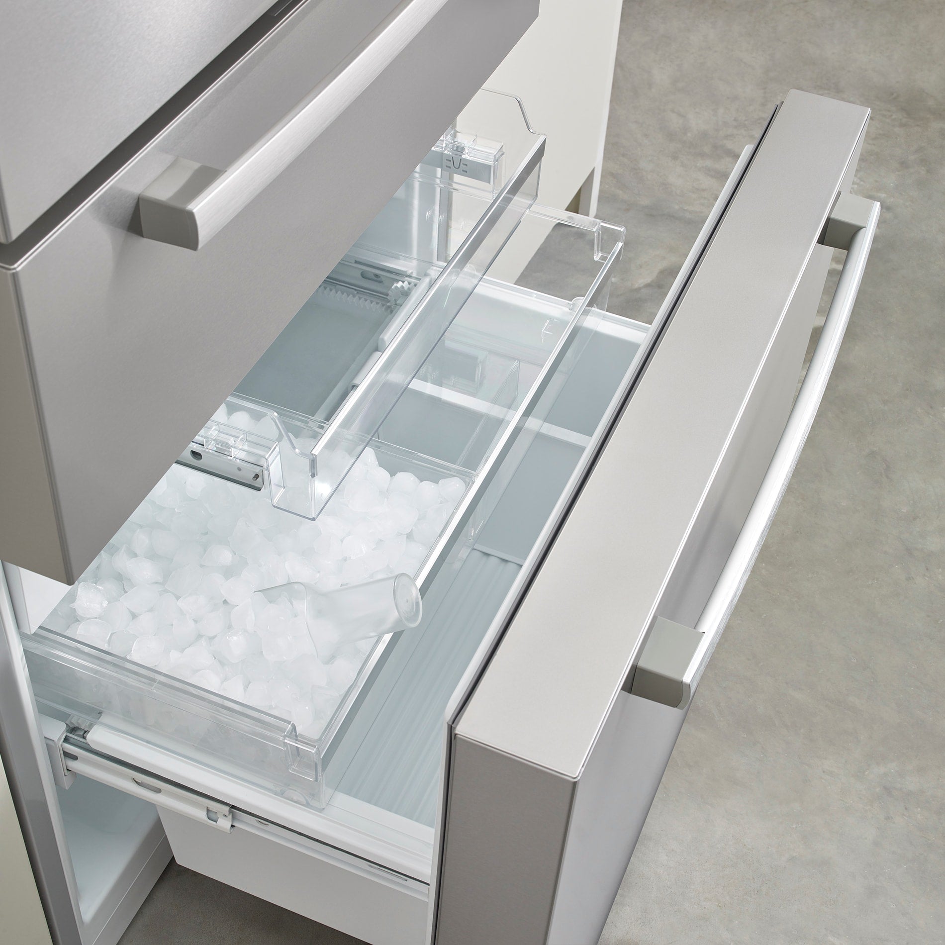 Bottom freezer ice maker makes beautiful pyramid-shaped ice, including a pull out bin and ice scoop