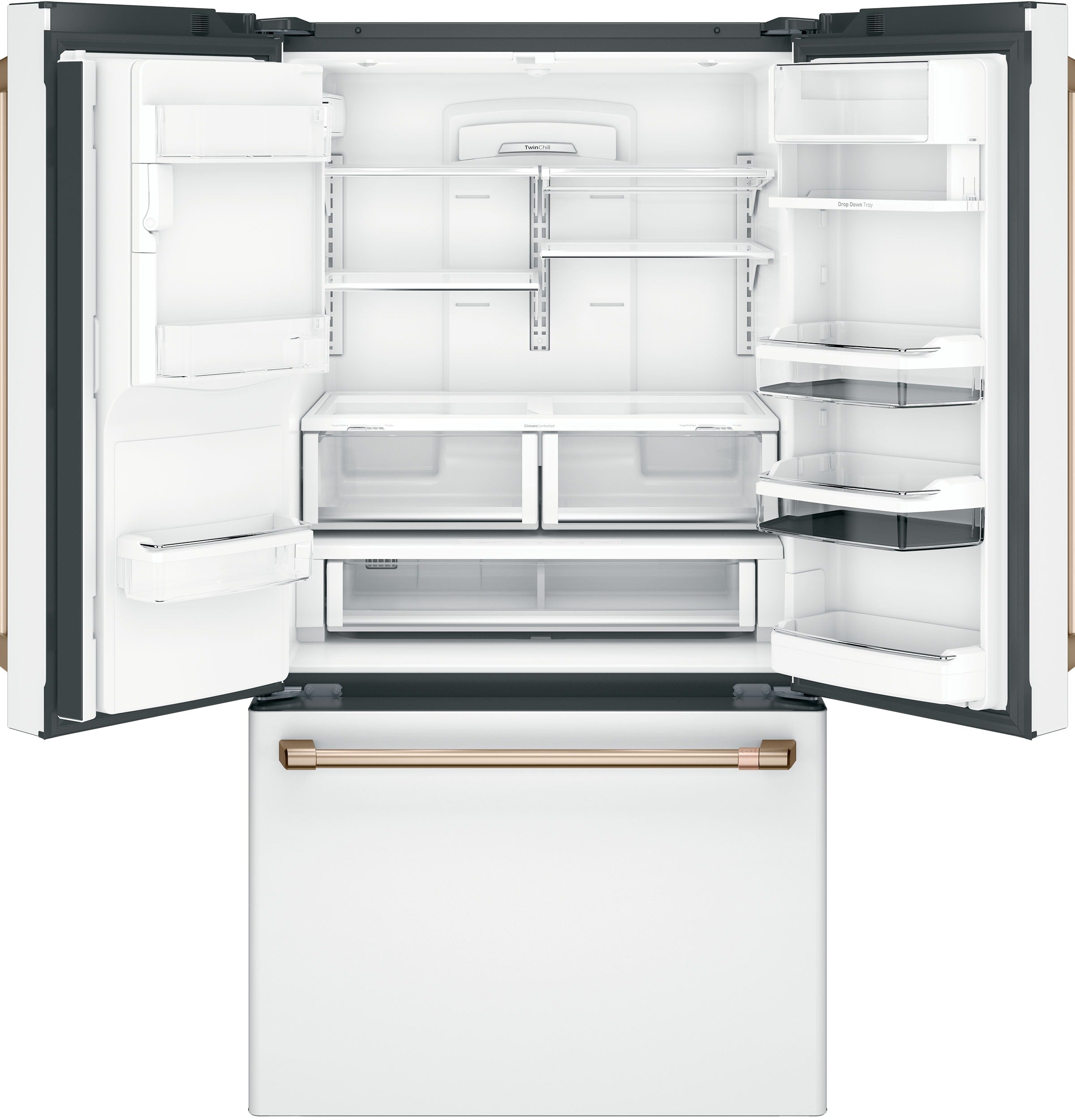 • Cafe Standard-Depth 27.8-cu ft 3 -Door Smart Compatible French Door Refrigerator with Ice Maker with Water and Ice Dispenser ( Matte White with Brushed Bronze Handles ) ENERGY STAR Certified