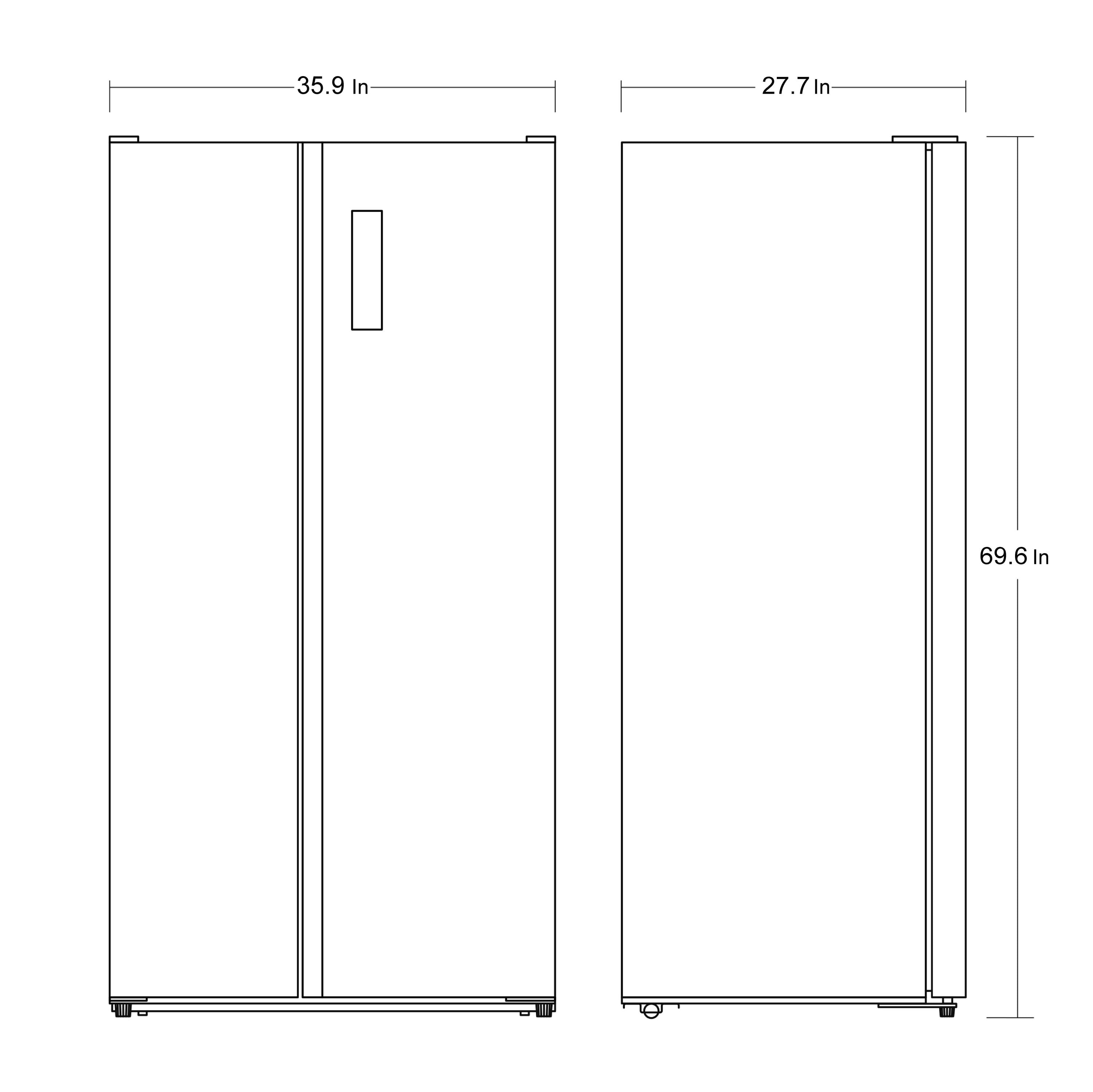 • Fresh Food in the right Door and Freezer in the left door, measuring WDH 35.8 x 26.4 x 66.7 inches
