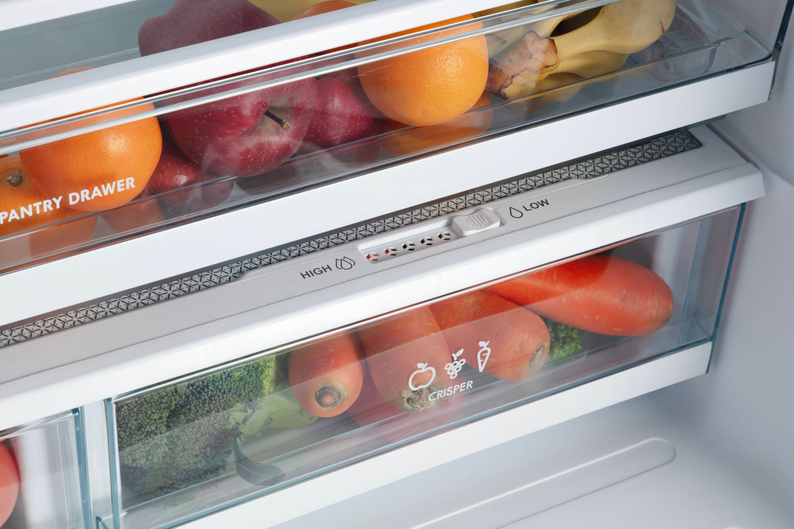 • Humidity controlled crisper drawers store fresh fruits and veggies